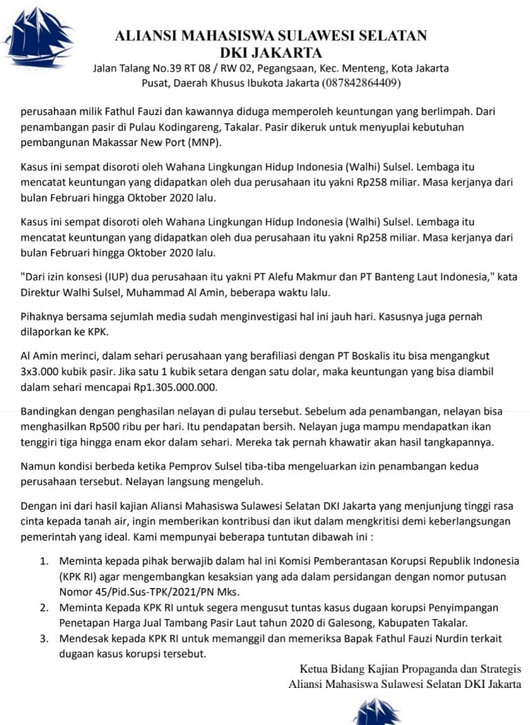 “Kami akan terus kawal kasus suap yg diindikasi oknum terlibat ini, jangan sampai mereka masih berkeliaran, mereka harus pertanggung jawabkan di depan hukum dan masyarakat Sulsel,” tutup alfayed