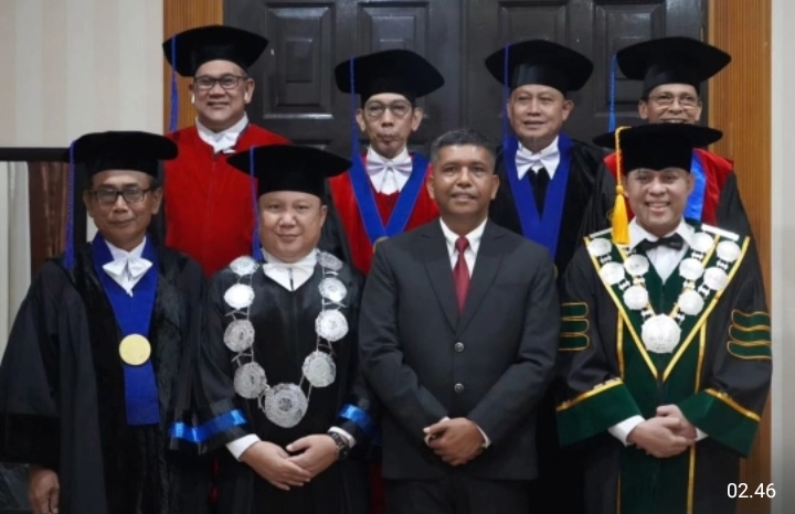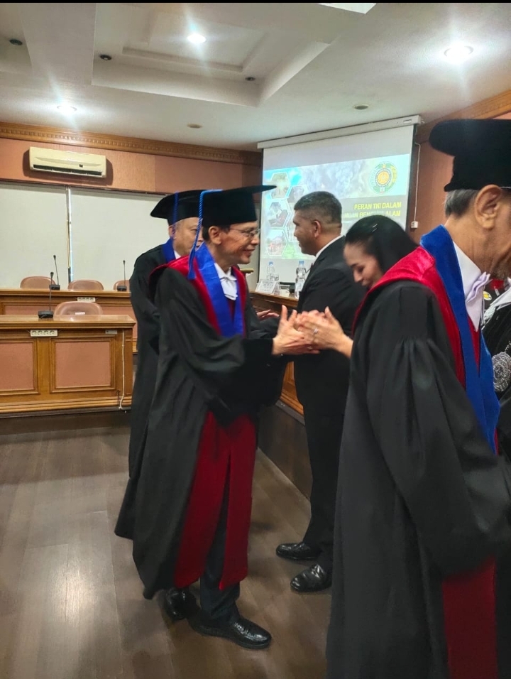 Wakil Rektor I Dr. Eddy Ikhsan SH. MH saat memimpin sidang Program Studi S3 Fakultas Ilmu Sosial dan Ilmu Politik Universitas Sumatera Utara (USU) menyampaikan “Kami para dosen dan mahasiswa Universitas Sumatera Utara sangat bangga sekali dengan keberhasilan seorang Pamen TNI AD Kolonel Inf Agustatius Sitepu meraih gelar Doktor melalui tahap ujian yang berat dengan Disertasi *Penanggulangan Bencana Alam (Gulbacel) Erupsi Gunung Sinabung*”
