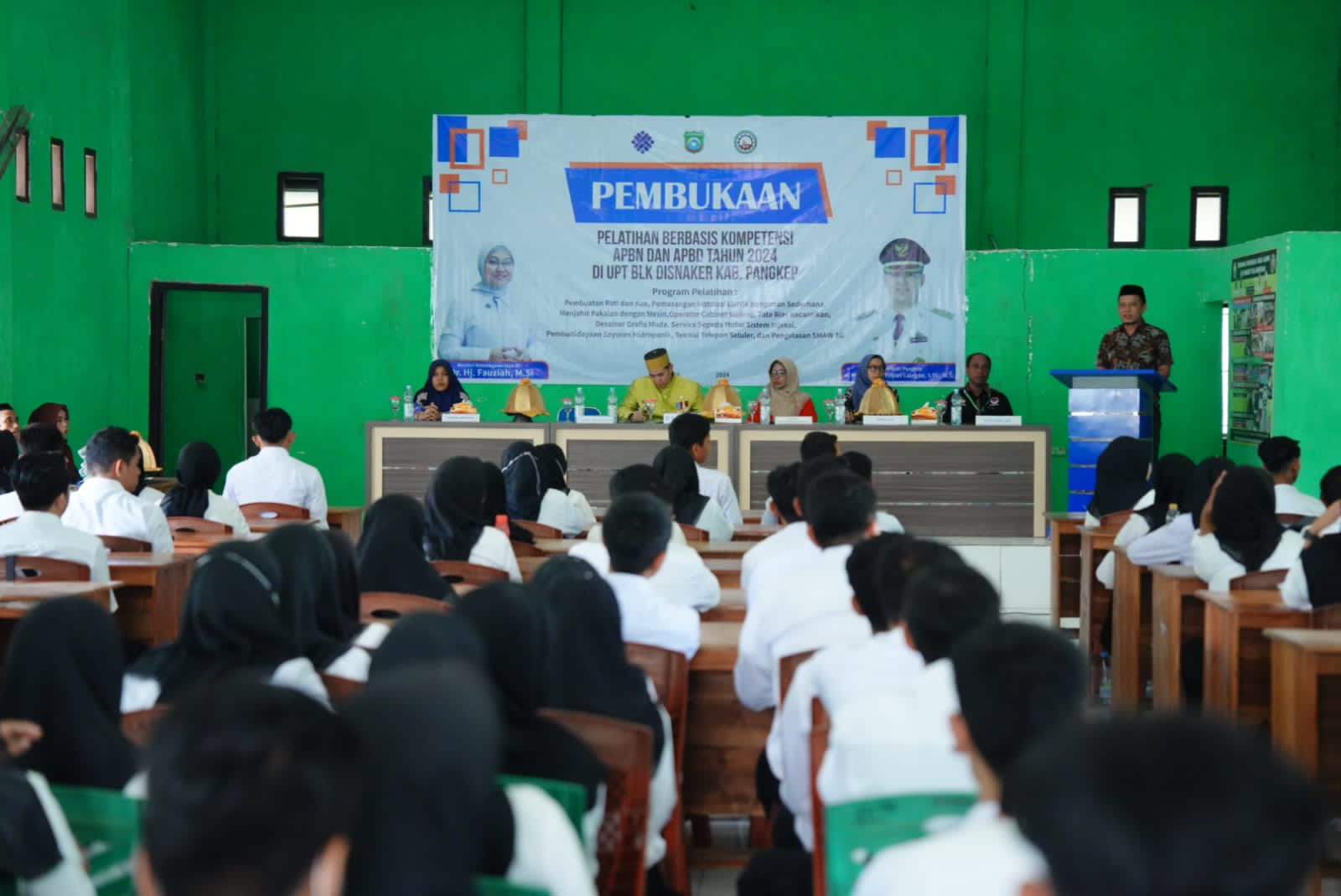 Pembukaan pelatihan BLK ditandai dengan pemasangan tanda pengenal oleh bupati kepada peserta, dihadiri Kepala Dinas Ketenagakerjaan Pangkep Najemiah, Kepala UPT BLK Pangkep, Kasmawati K dan Peserta Pelatihan.