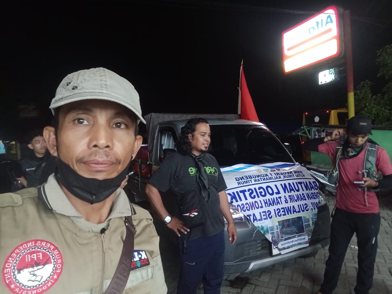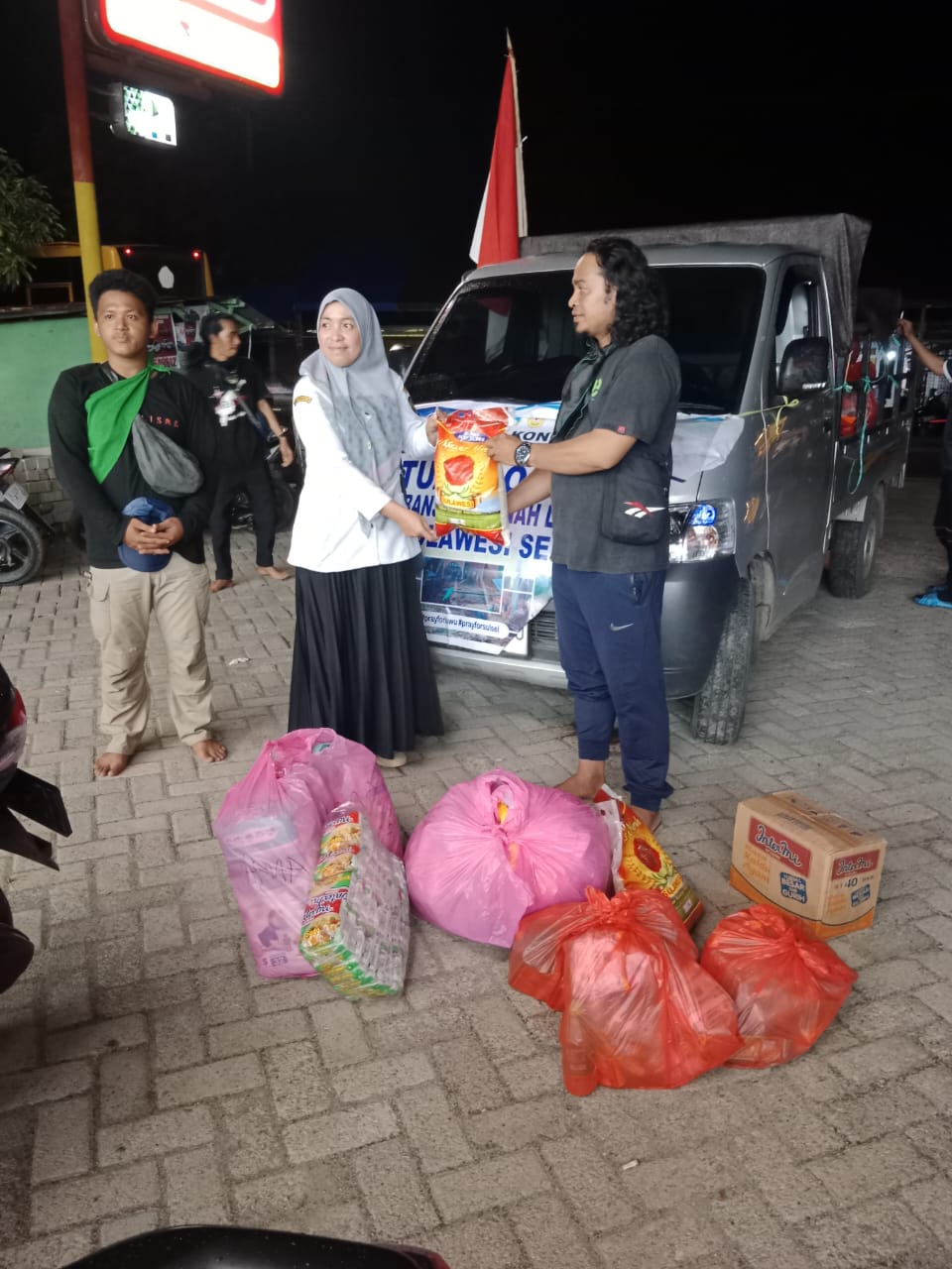 Terlihat satu unit pick up , sarat dengan muatan sembilan bahan pokok , beras, minyak, gula , kopi , supermi, susu dan lain – lain yang belum selesai diturunkan oleh tim SMK Negri 1 Kongbeng Kutai Timur Kalimantan Timur .
