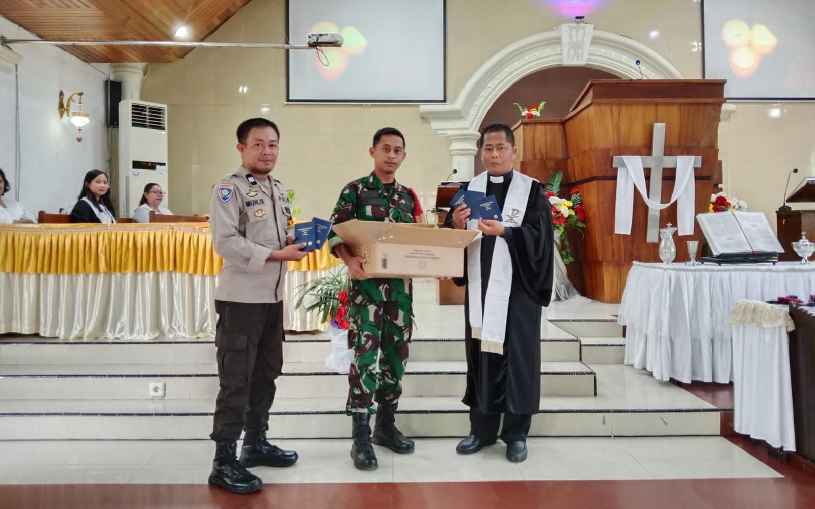 Selain memberikan ketenangan dan rasa nyaman kepada masyarakat utamanya yang sedang menjalankan ibadah. Kehadiran Babinsa bersama Bhabinkamtibmas Kelurahan Sambung Jawa juga melakukan penyaluran 100 Alkitab kepada jemaat Tanjung Marannu secara simbolis yang diterima oleh Pendeta Karia, ST, MM.
