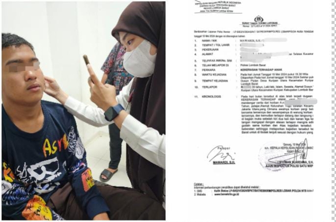 LOBAR NTB KLTV Indonesia, —klivetvindonesia.com— RTP (14) Siswa Kelas VIII SMP Islam Nurul Madinah putra dari Dra.Kasihhati Ketua Presidium Forum Pers Independent Indonesia (FPII) yang sedang menimba ilmu di Pondok Pesantren Nurul Madinah Jl. Pramuka No 25B Pelulan-Kuripan Utara, Kuripan Utara, Kec. Kuripan, Kab. Lombok Barat Prov. Nusa Tenggara Barat mendapatkan kekerasan hingga mengalami luka lebam dibagian wajah sebelah kiri dan kanan oleh R (35) yang mengira adiknya digoda oleh RTP.