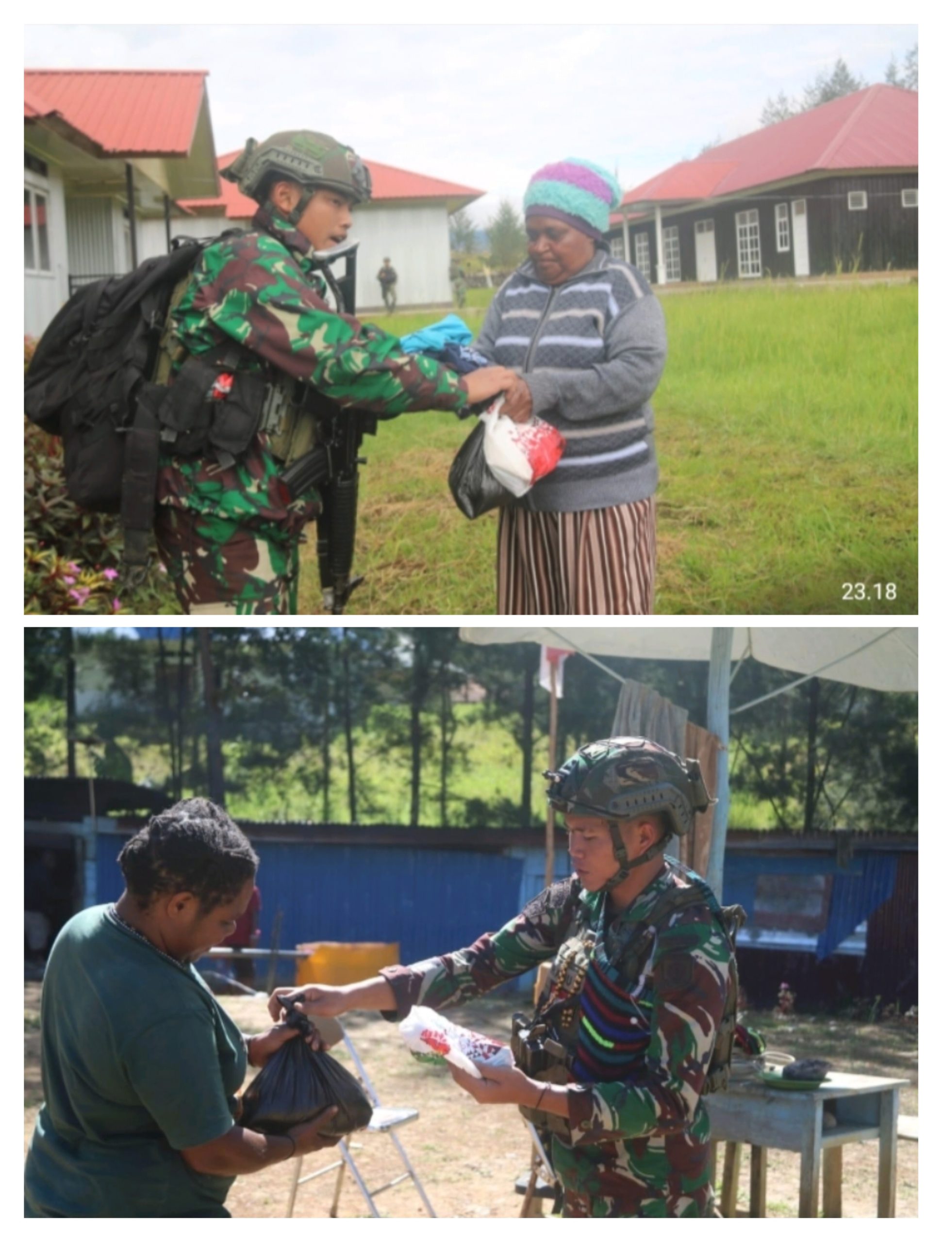 Pasiter Satgas Letda Chk Dani mengatakan “Pemberian bantuan sembako dan pakaian layak pakai terhadap masyarakat Kampung Kago adalah suatu wujud nyata kepedulian dari satgas mobile Yonif 323/BP kepada masyarakat, salah satu bantuan sembako kami berikan kepada masyarakat Mama Meri Tabuni dan Uti Wenda karena beliau merupakan mama yang di hormati oleh masyarakat Kampung Kago.”