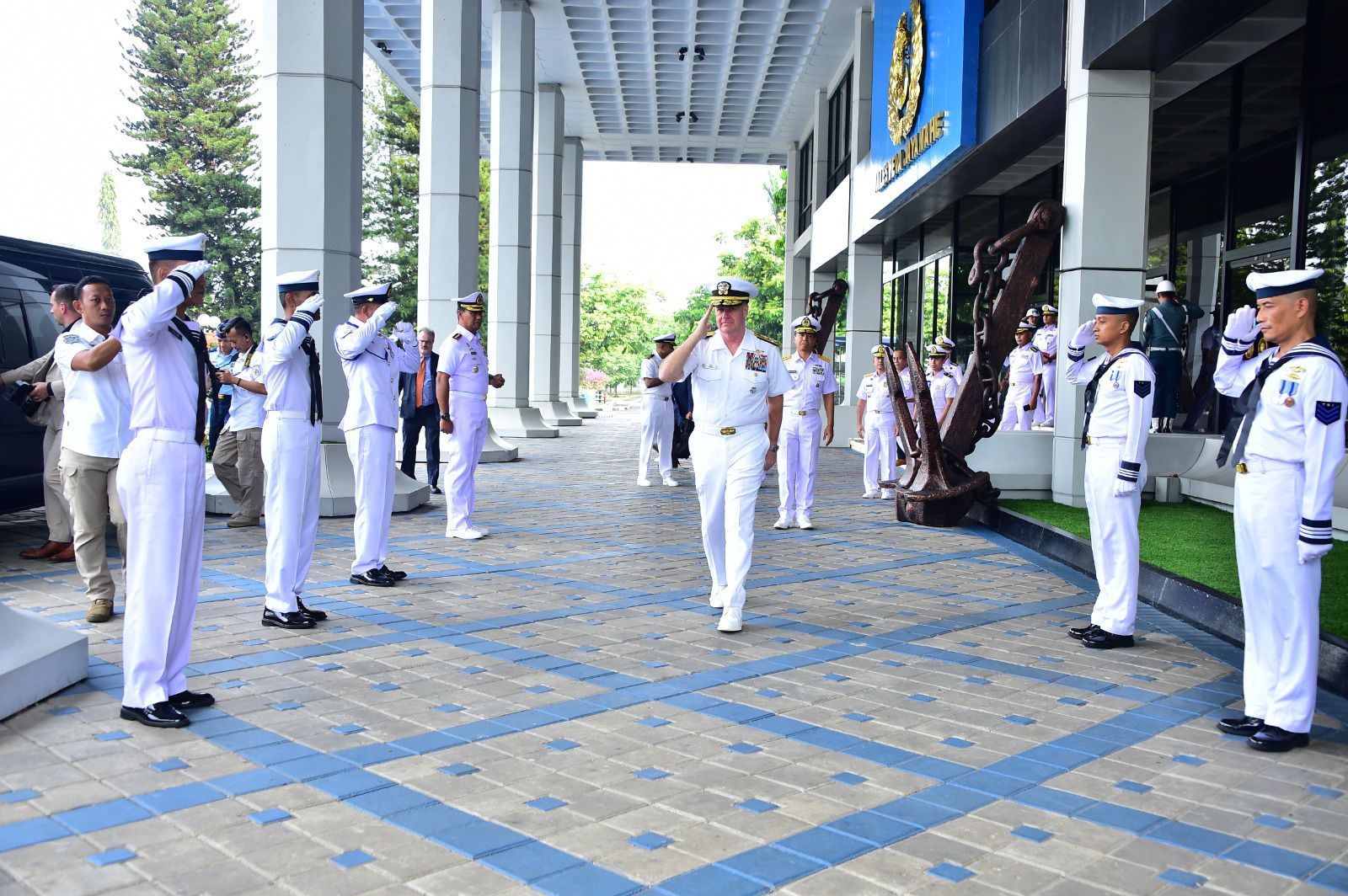Kedatangan Admiral Samuel J. Paparo dan rombongan di halaman Gedung R.E Martadinata Mabesal disambut hangat oleh Wakasal Laksamana Madya TNI Erwin S. Aldedharma beserta jajarannya dengan pasukan jajar kehormatan.