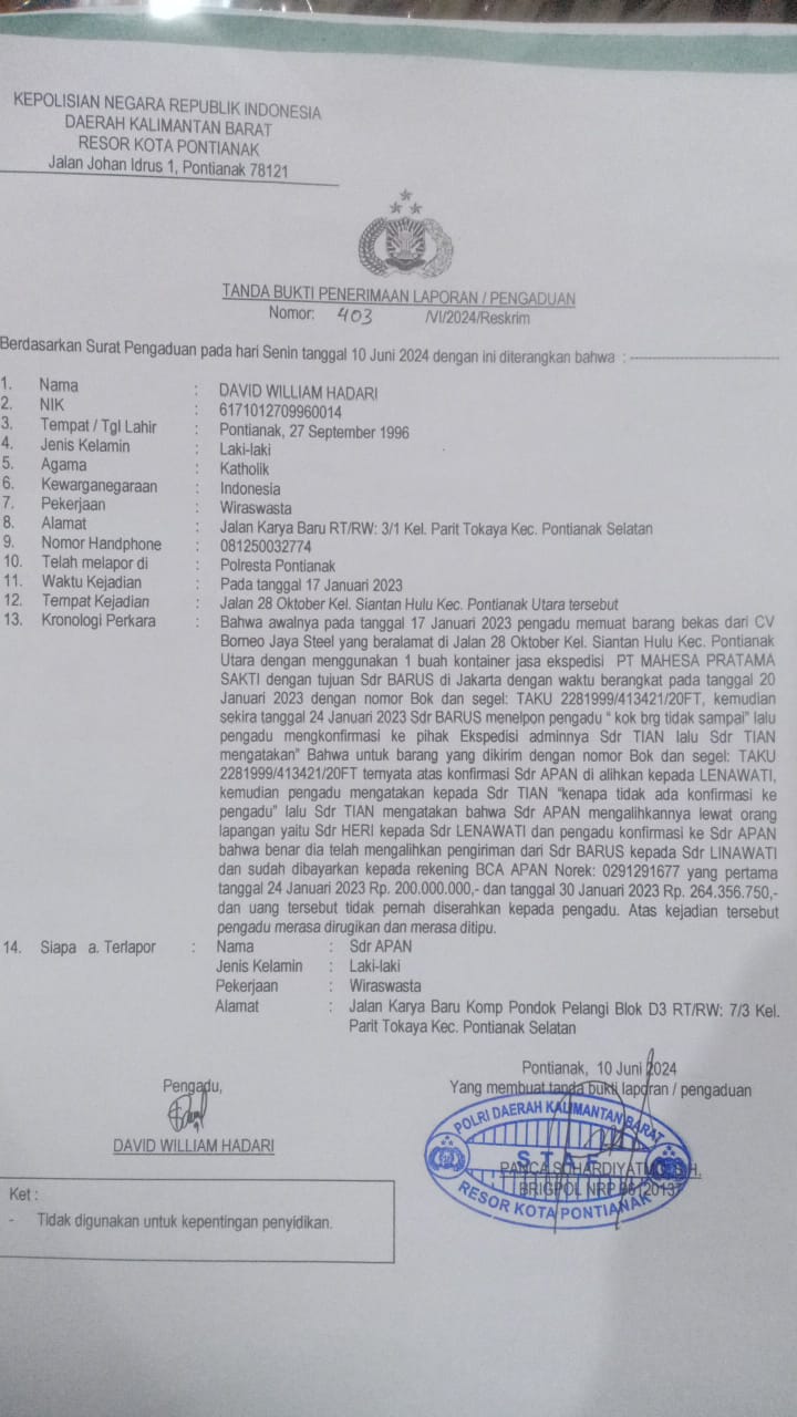 Klivetvindonesia.com, Pontianak – Kantor Advokasi dan Konsultasi Hukum Yohanes Nenes, SH, telah menempuh jalur hukum terkait pengrusakan papan plang yang dipasang di tempat usaha CV Borneo Jaya Steel milik kliennya, David.