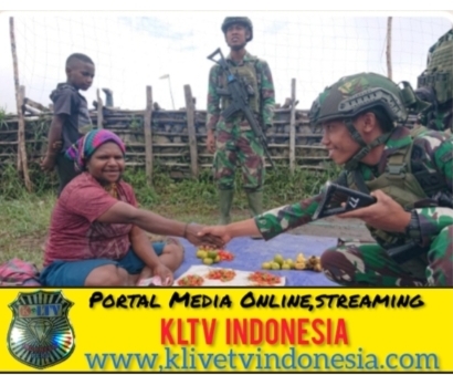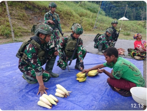[ PUNCAK PAPUA ] -KLTV INDONESIA.COM- Prajurit satgas mobile Yonif 323 Buaya Putih membantu membeli hasil tani masyarakat yang dijual mama-mama Papua didepan TK Pintu Jawa, Kabupaten Puncak, Papua, Rabu (19/06/2024).