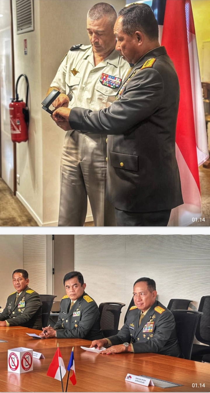-KLTV INDONESIA.COM- Di sela-sela kunjungan kerjanya di Paris dalam menghadiri undangan pameran Eurosatory 2024, Panglima TNI Jenderal TNI Agus Subiyanto mengunjungi Markas Angkatan Bersenjata Perancis dalam rangka memenuhi undangan Panglima Angkatan Bersenjata Perancis General Thierry Burkhard untuk meningkatkan kerja sama di bidang pertahanan dan keamanan, Paris (19/06/2024)