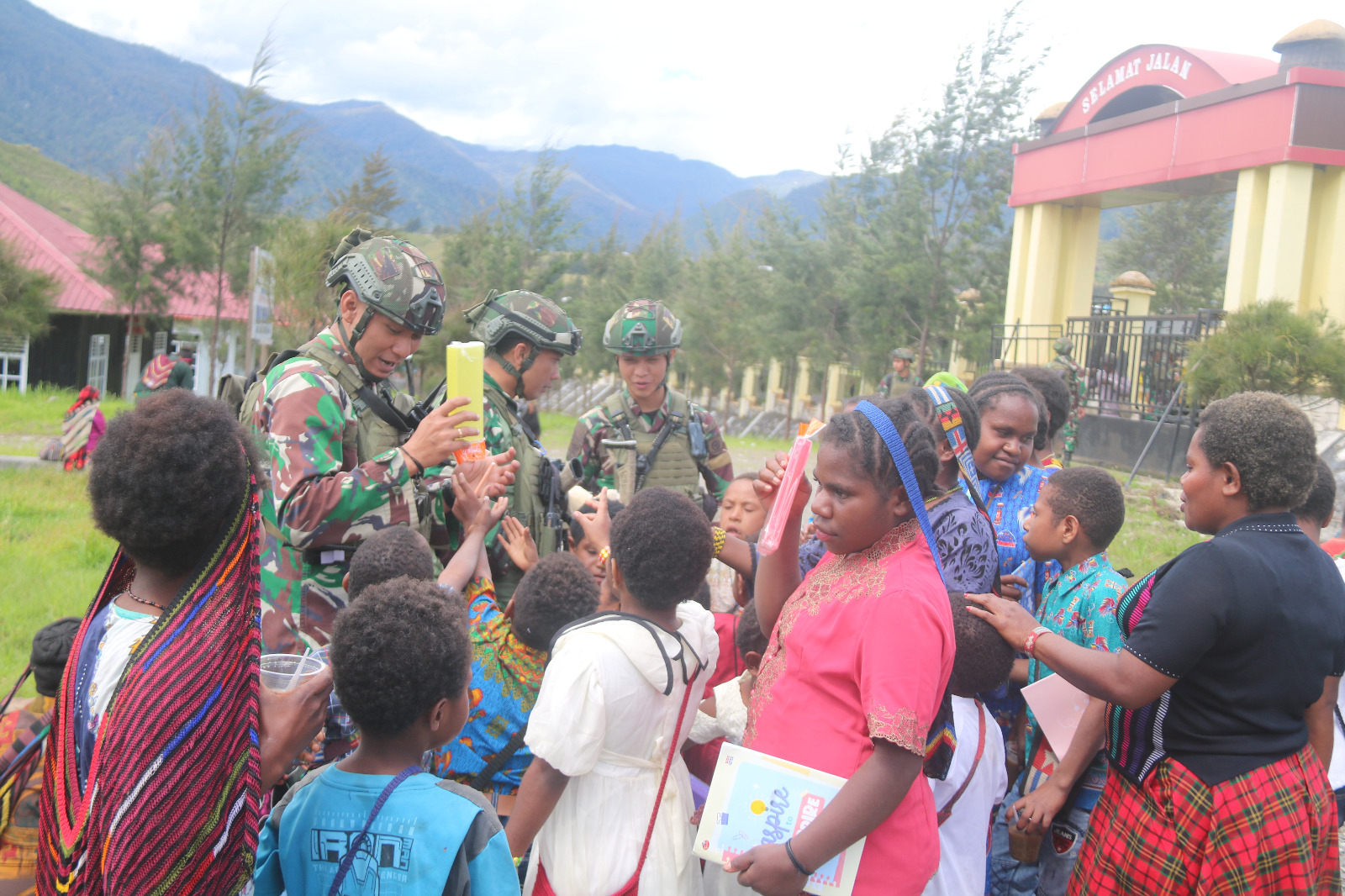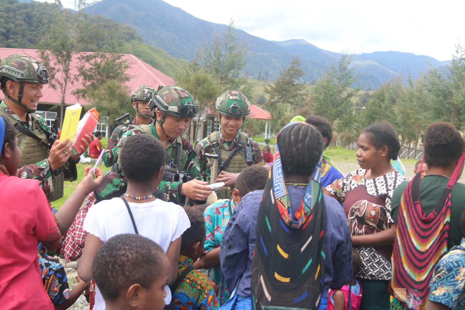 –klivetvindonesia.com-[ PUNCAK PAPUA ] – Berbagi keceriaan bersama Anak-anak Distrik Ilaga, Satgas Mobile Yonif 323 Buaya Putih memberikan buku dan alat tulis sekaligus memotivasi para anak-anak untuk giat belajar menuntut ilmu, Kampung Wako, Kabupaten Puncak, Papua, Kamis (27/06/2024).