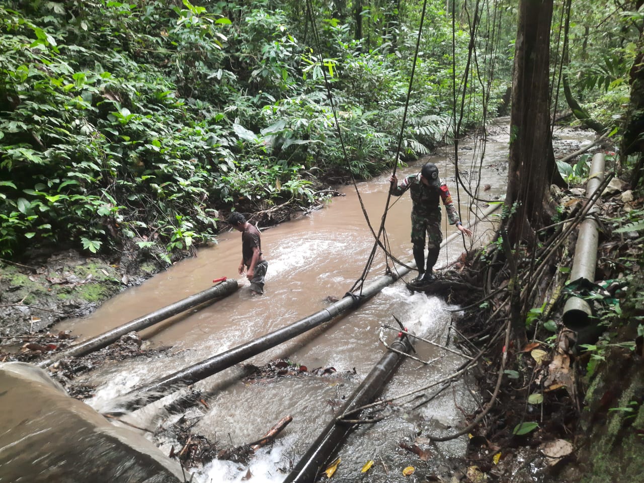 Sanggau -KLTV INDONESIAklivetvindonesia.comSatuan Tugas Pengamanan Perbatasan (Satgas Pamtas) RI-Malaysia Yonkav 12/BC bantu warga masyarakat memperbaiki dan pembersihan bendungan air di Dusun Segumon , Desa Lubuk Sabuk, Kec. Sekayam, Kabupaten Sanggau, Kalimantan Barat, Kamis (27/06/2024).