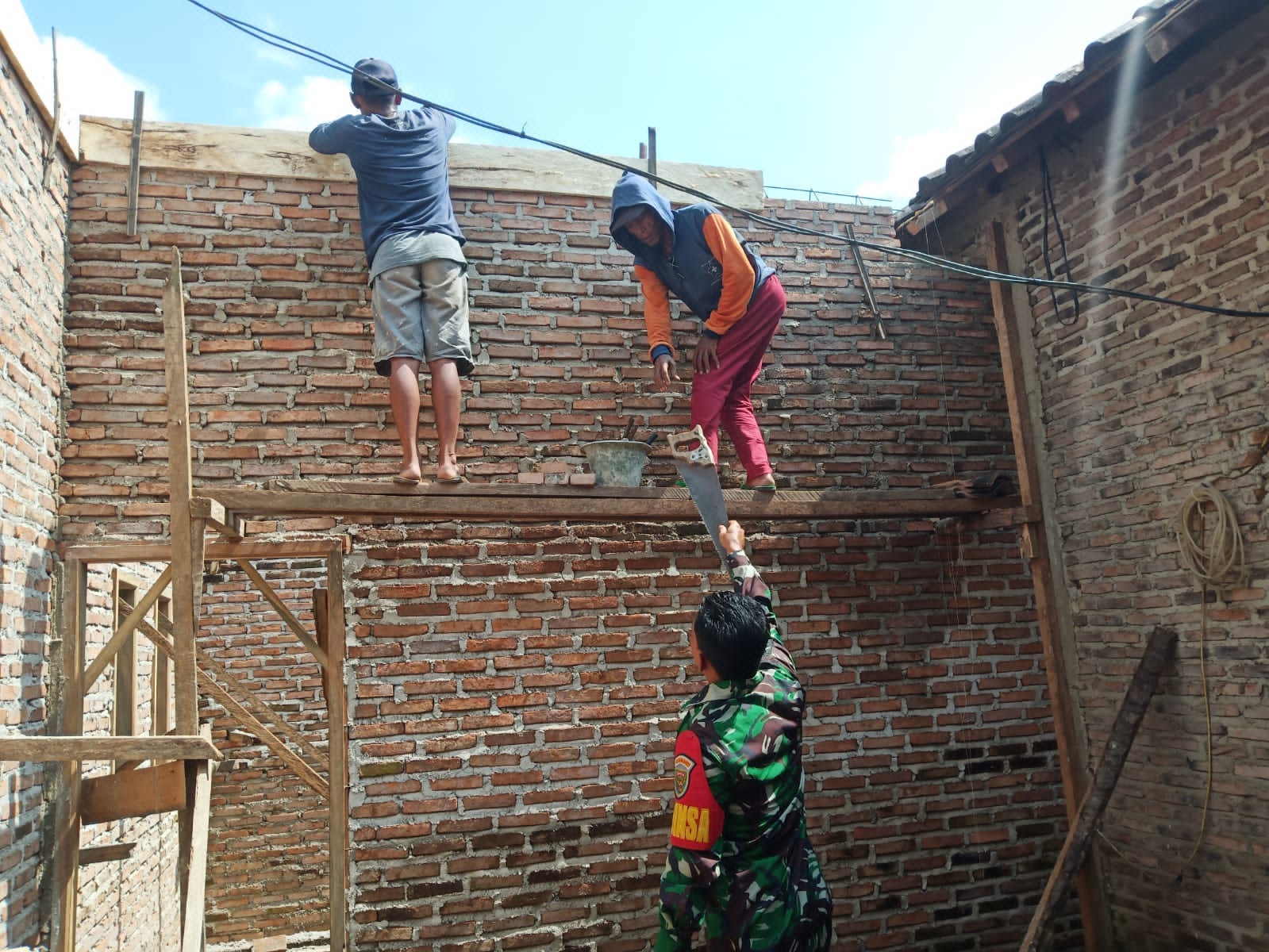 Klivetvindonesia,com. Pesawaran- Babinsa Koramil 421-01/KDD Sertu Ariyanto melaksanakan kegiatan Komunikasi Sosial (Komsos) dengan masyarakat para pekerja yang sedang bekerja membangun rumah salah satu warga di Kampung Pancasila Desa Paguyuban Kecamatan Way Lima, Kabupaten Pesawaran. Jum’at (28/6/2024).