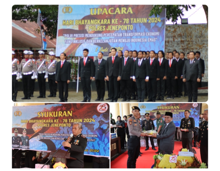 –klivetvindonesia.com-– Peringatan puncak perayaan hari Bhayangkara ke 78 di Polres Jeneponto Polda Sulsel di gelar upacara di halaman Kantor Bupati Jeneponto, Senin (01/07/2024).