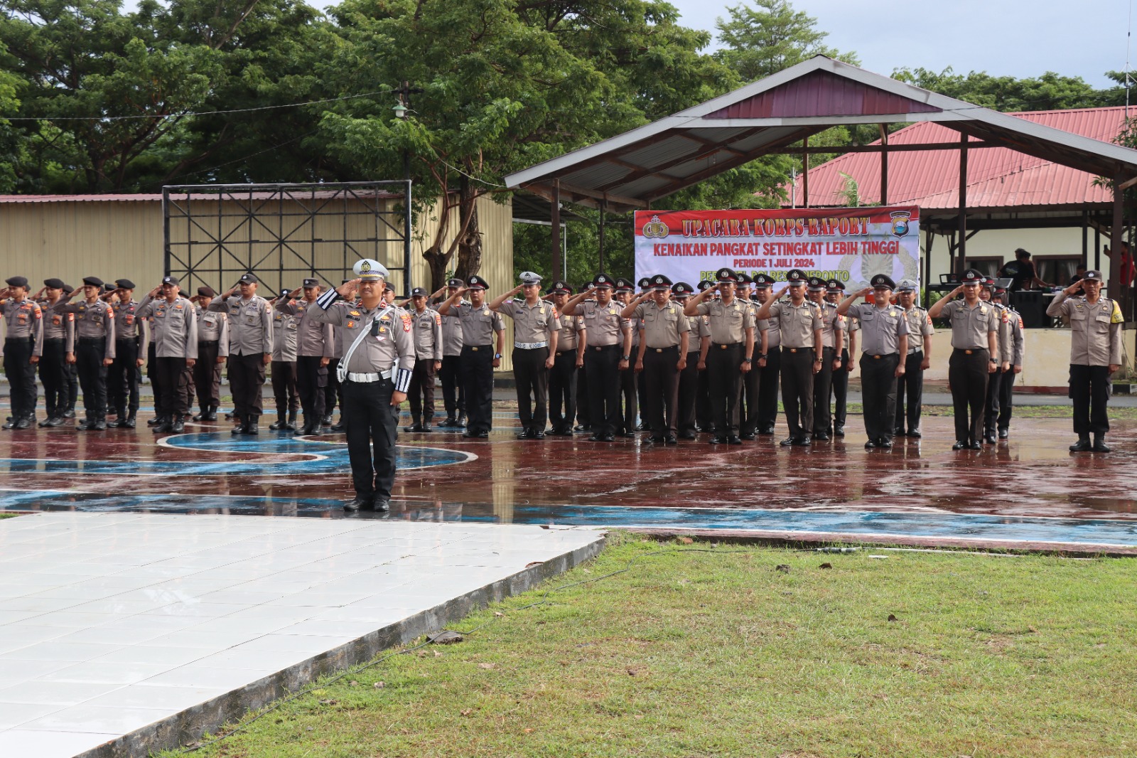 –klivetvindonesia.com— Kepala Kepolisian Resort (Kapolres) Jeneponto AKBP Budi Hidayat, S.I.K., pimpin upacara Korps Raport kenaikan pangkat setingkat lebih tinggi bagi personil Polres, priode 1 Januari 2024 di halaman Mapolres Jeneponto, Rabu (02/07/24)
