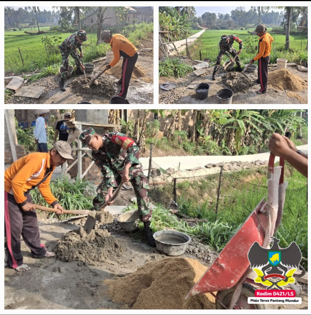 Klivetvindonesia,com. Pesawaran- Kebersamaan dan kedekatan Babinsa bersama masyarakat di wilayah binaannya, ditunjukan oleh Pratu Dian Saputra Babinsa desa Sukaraja Koramil 421-02/Gedong Tataan bersama masyarakat binaan di Desa Sukaraja, dalam melaksanakan kerja bakti perbaikan jalan cor yang melintasi lahan persawahan di Desa Sukaraja , Kecamatan Gedong Tataan, Rabu (17/07/2024).