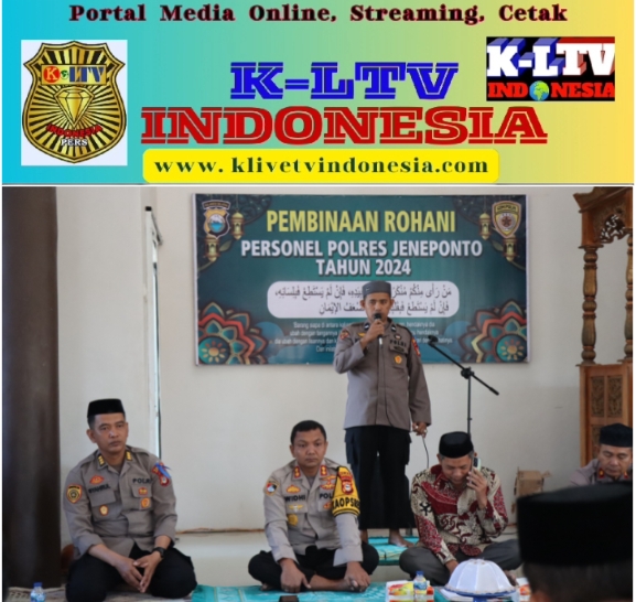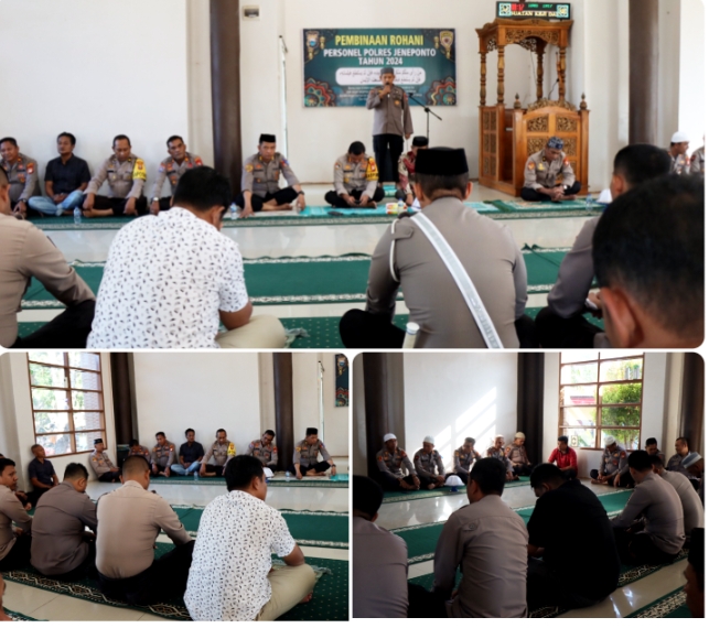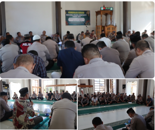 –klivetvindonesia.com— Kapolres Jeneponto AKBP Widi Setiawan, S.IK., M.IK. menggelar pembinaan kerohanian Mental (Binrohtal) perdana bersama personel di Masjid Nur Asy – Syurthi Polres Jeneponto. Kegiatan rutin ini dilaksanakan setiap Kamis pagi dan melibatkan seluruh personel yang beragama Islam, Kamis, 18/7/2024.