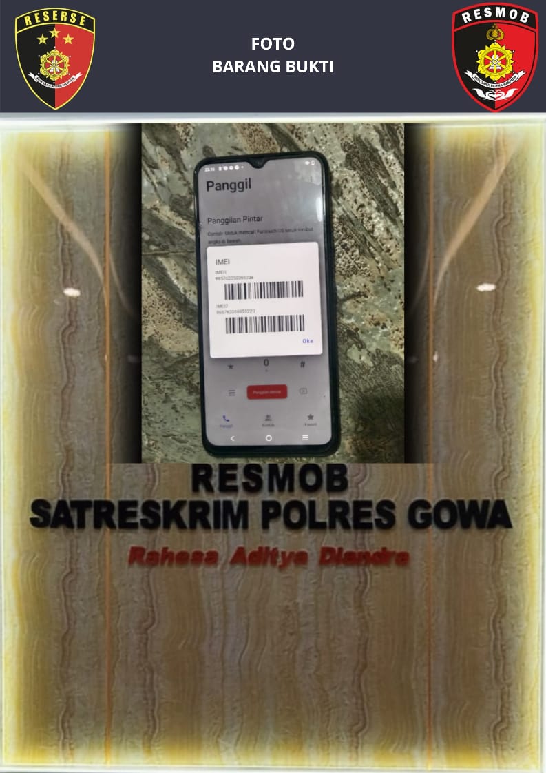 Dalam penangkapan tersebut, Tim Resmob mengamankan barang bukti berupa satu unit HP merk Vivo V20 SE warna hitam dengan IMEI 1: 865762058059238 dan IMEI 2: 865762058059220, milik korban Faradiba Mustaina Tenriana (27), seorang ibu rumah tangga yang beralamat di Jalan Syekh Yusuf, Kecamatan Somba Opu, Kabupaten Gowa.