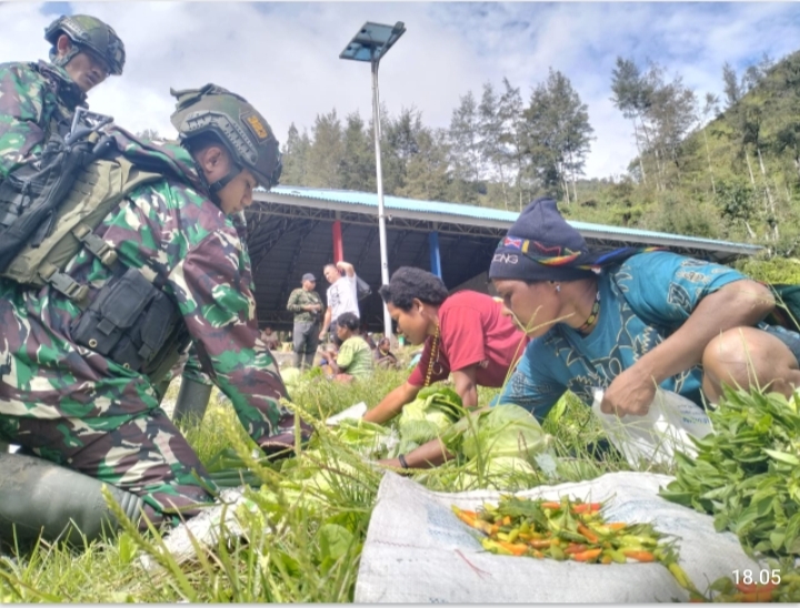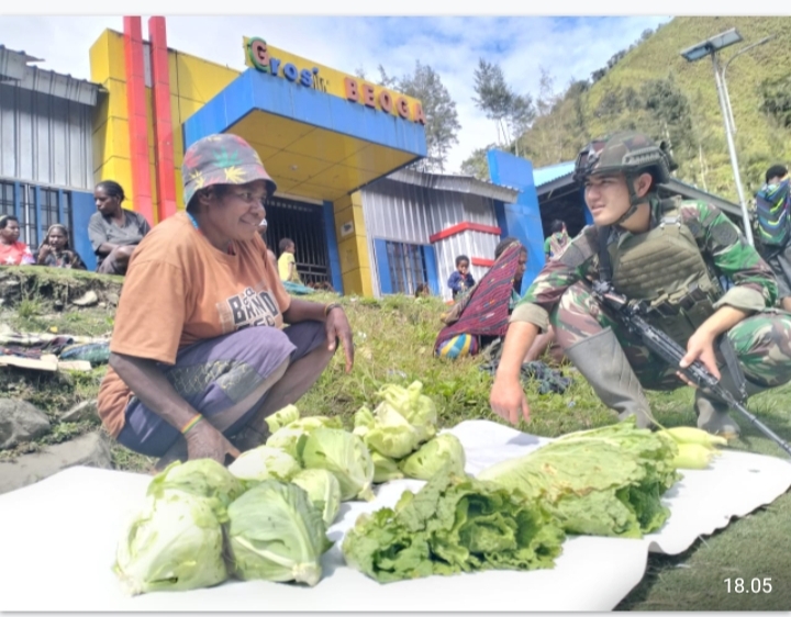 [ PAPUA TENGAH ] -KLTV INDONESIA.COM- Satgas Yonif Raider 323 Buaya Putih Pos Beoga melaksanakan program ROSITA (Borong Hasil Tani) di Pasar Beoga, Kampung Milawak, Distrik Beoga, Papua Tengah, Sabtu (27/7/2024).