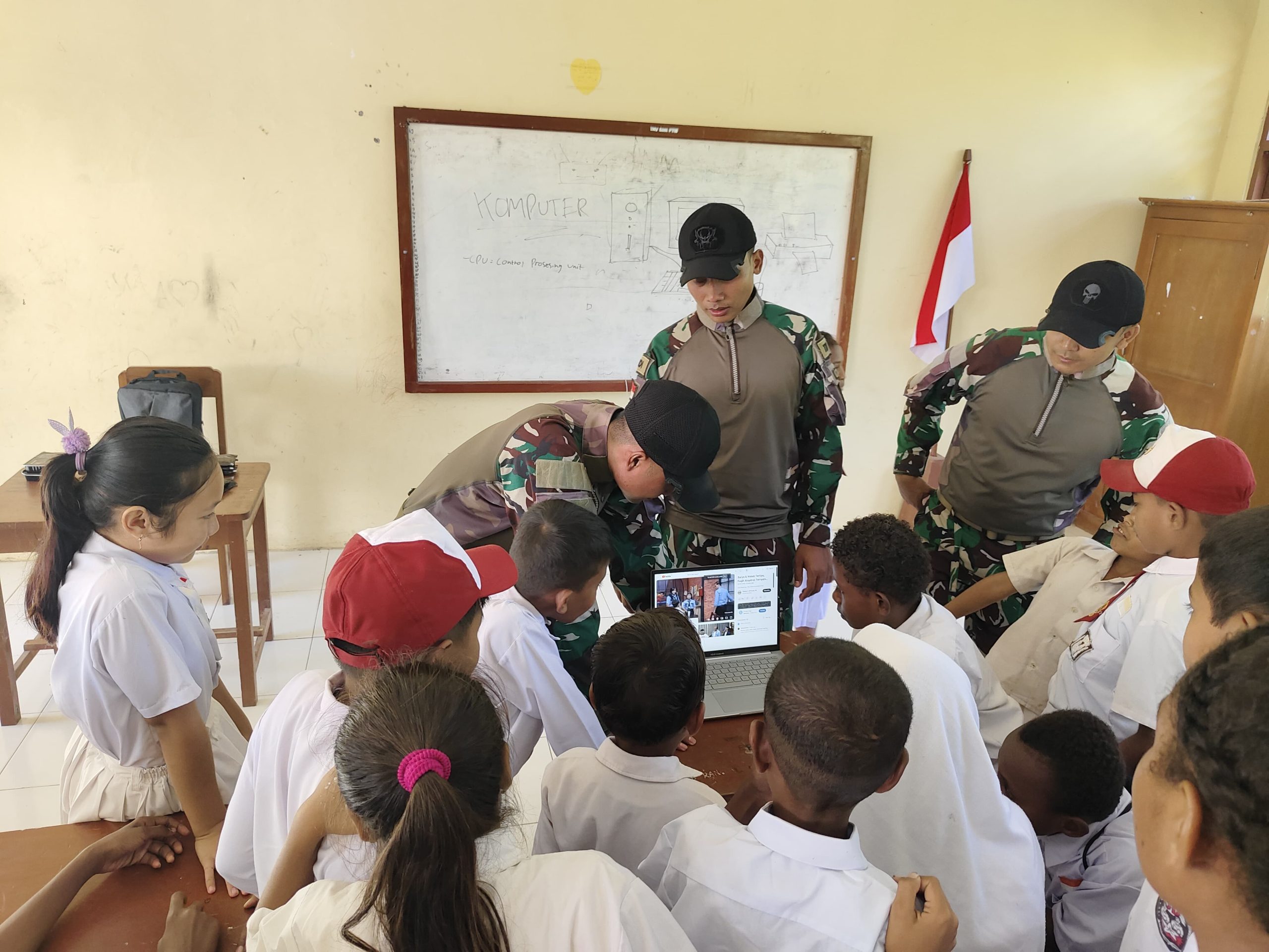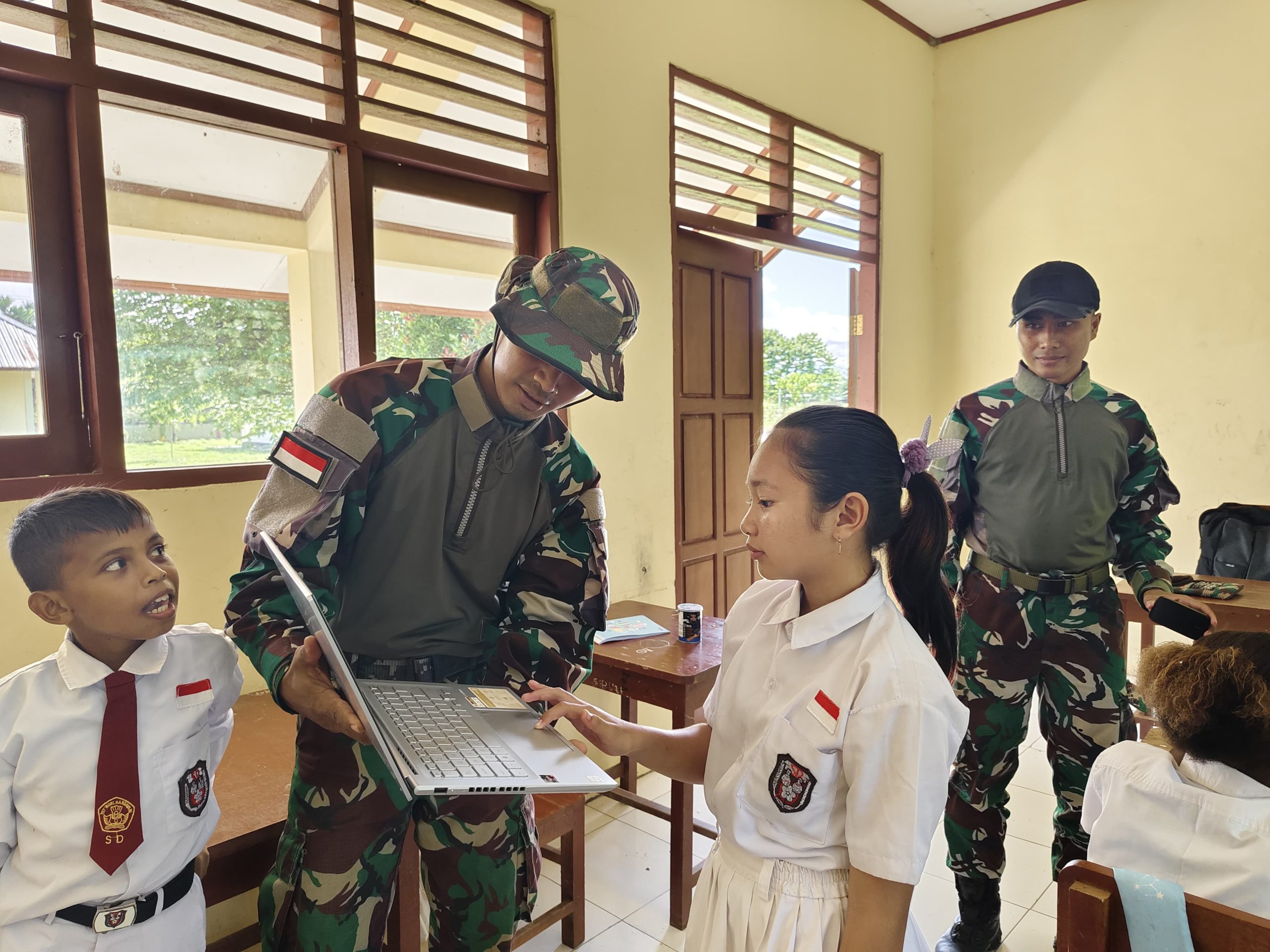 Kabupaten Keerom -KLTV INDONESIA –klivetvindonesia.com— Satgas Pamtas Statis RI-PNG Yonif 122/TS Pos Koki B Pitewi mengenalkan dan melaksanakan program kegiatan pengoperasian Komputer untuk membantu dalam pengenalan dasar komputer dan laptop di SD Negeri Pitewi, Kampung Pitewi Distrik Arso Timur, Kabupaten Keerom, Papua, Senin (29/07/2024).