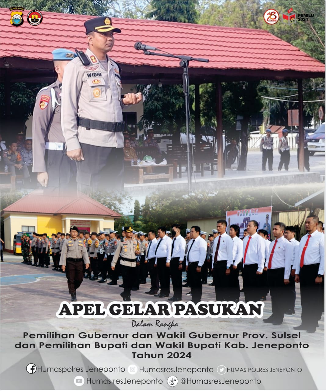 ” Apel Gelar Pasukan ini bertujuan untuk memeriksa kesiapan kita dalam rangka pengamanan Pemilukada 2024, kita periksa kesiapan personil, kesiapan operasional, kesiapan peralatan dan kesiapan lainnya, termasuk kondisi kesehatan dari personil pengamanan, dengan harapan bahwa kita akan mampu mewujudkan Pemilukada 2024 dengan aman dan kondusif di kabupaten Jeneponto”.