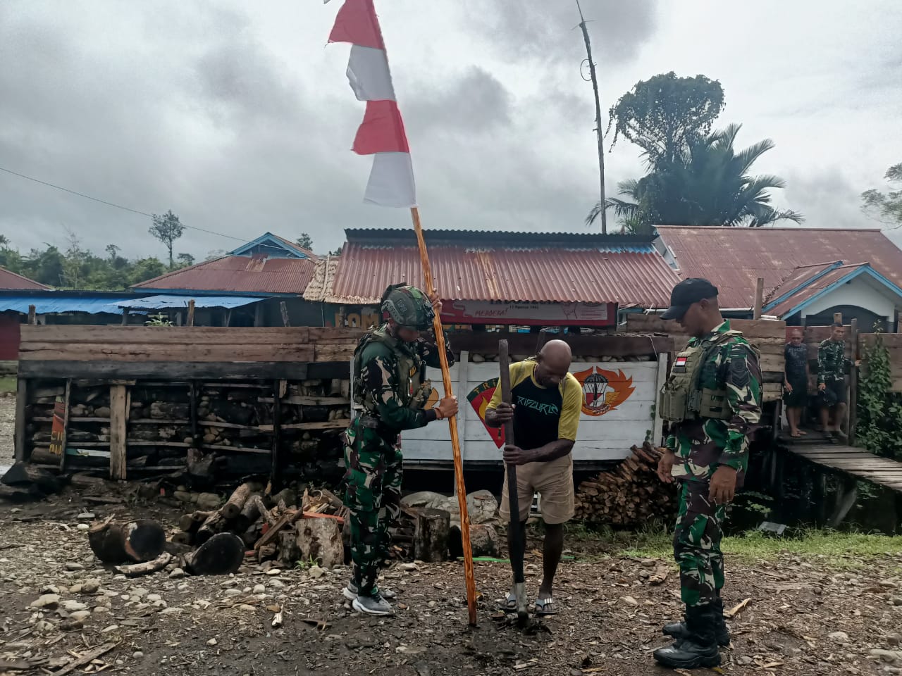 Dalam rangka menyambut Peringatan Hari Ulang Tahun (HUT) Ke-79 Kemerdekaan Republik Indonesia tahun 2024, warga Kampung Mumugu, Distrik Krepkuri, bersama para Prajurit Satgas Yonif 503 Kostrad melaksanakan pemasangan Bendera Merah Putih di area publik dan pinggir jalan umum.
