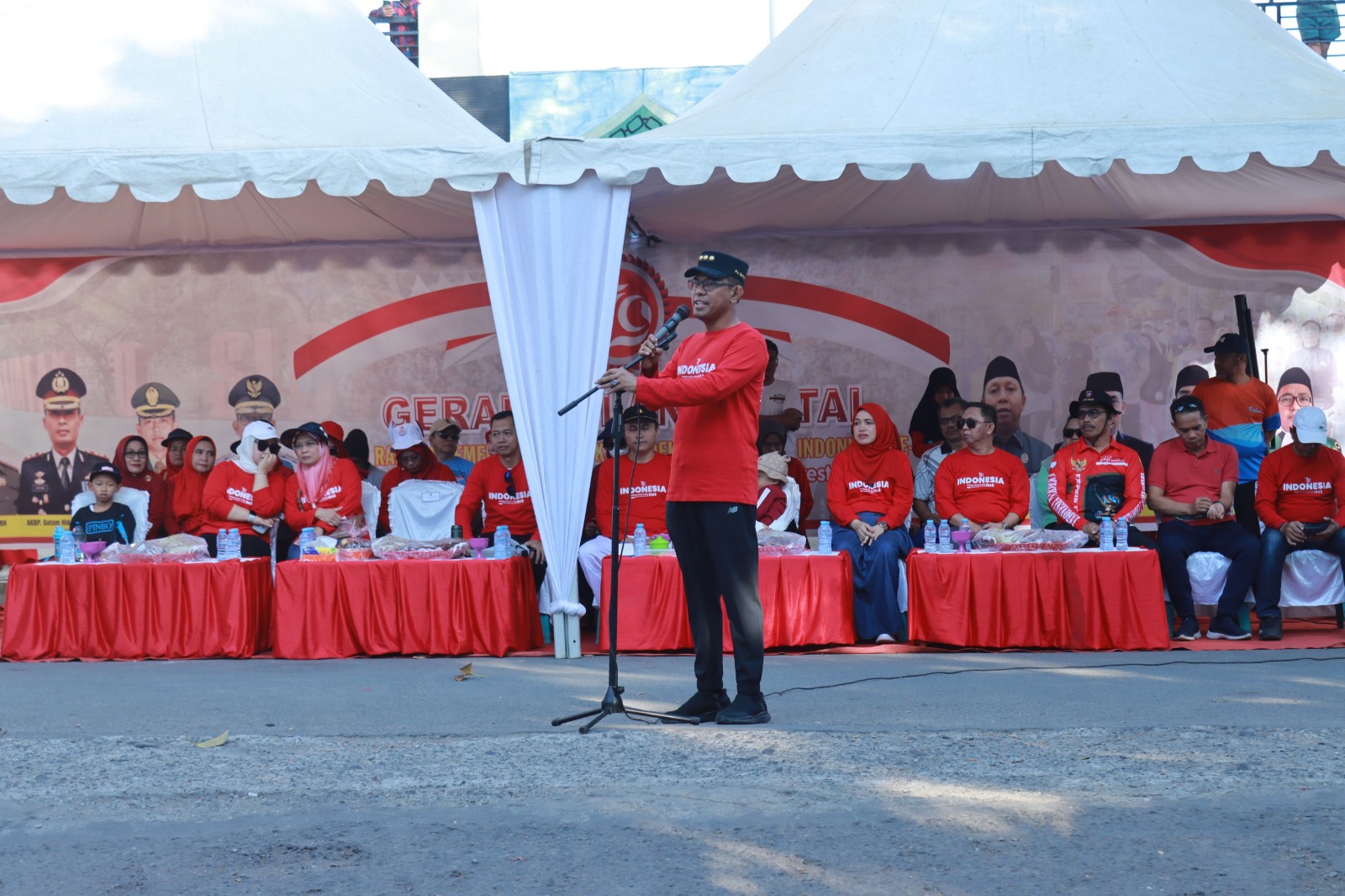 Dalam melepas peserta Gerak Jalan Santai, Pj. Bupati menyampaikan bahwa kehadiran kita semua ditempat ini adalah wujud dari cinta kita, rasa syukur kita terhadap kemerdekaan yang sudah kita raih selama ini dan sedang kita diupayakan melalui karya kita semua sesuai dengan peran kita masing-masing mulai dari TNI/Polri, ASN, Tokoh Agama, Tokoh Masyarakat, Tokoh Pemuda dan Masyarakat.