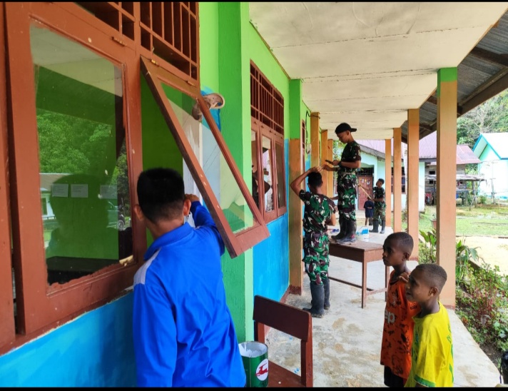 Laksanakan Bakti TNI, Satgas Yonif 762/VYS Lakukan Pengecatan Gedung Sekolah