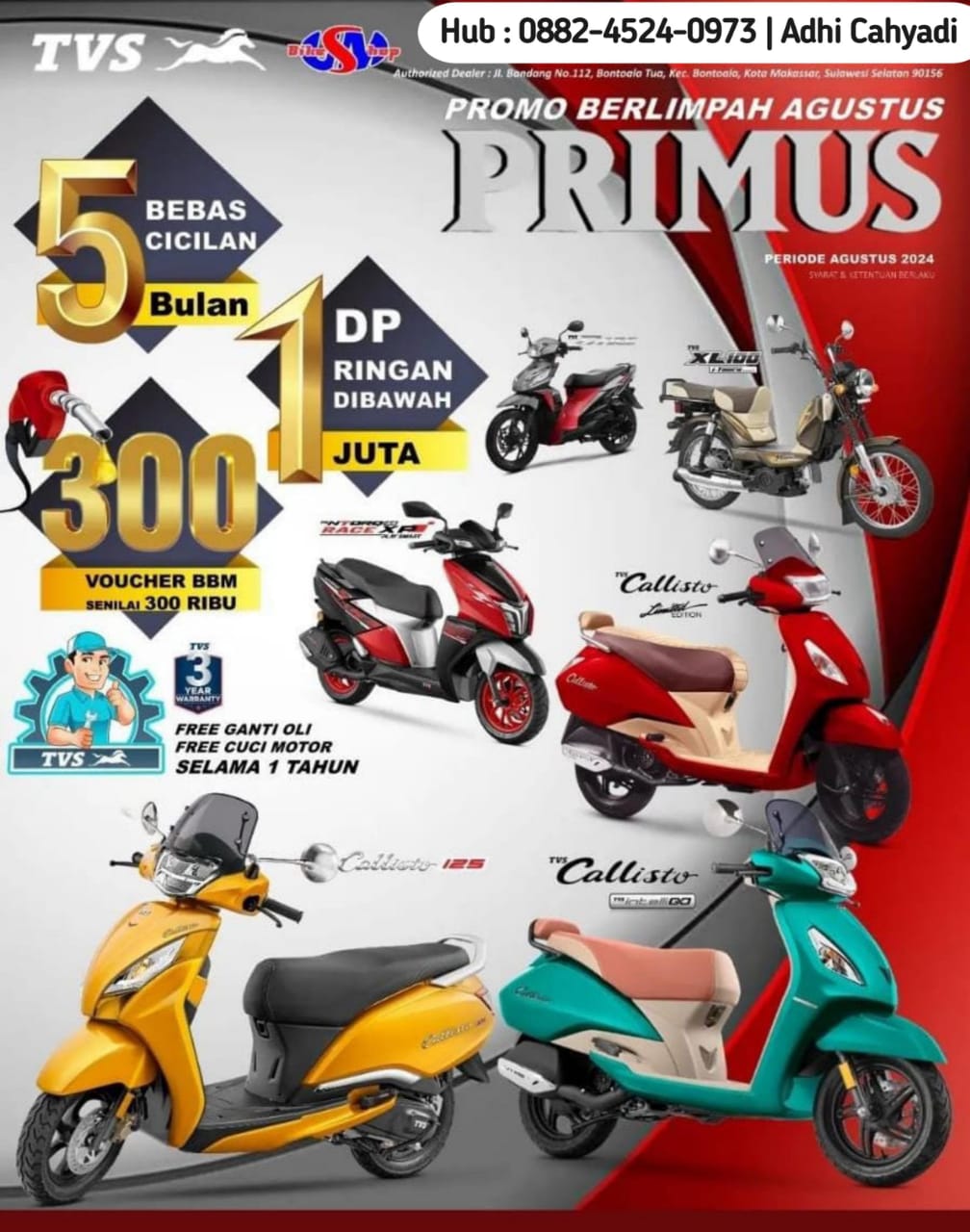 Bagi Mitra Yang Bantu PenjuaLan ( Acc) Komisi Rp. 300 Ribu โก๏ธDP Ringan 1 Jutaan โก๏ธBebas CiciLan 5 BuLan โก๏ธVoucher UANG BENSIN SENILAI Rp. 300 Ribu โก๏ธGratis Jasa Servis & OLI โก๏ธDan Ber Aneka Hadiah Hiburan Lainnya Hubungi ๐ฒ 0882 4524 0973 ๐ Adi Cahyadi โ๏ธ Ayoo BeLi Motor TVS Sekarang juga โ๐ป๐ซฑ๐ปโ๐ซฒ๐ป๐ฐ๐ด๐งฐ๐ฆ๐๐๐๏ธ๐๐๐ฅณ(ย )