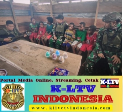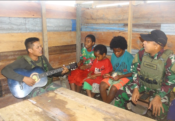 [ KENYAM NDUGA ] KLTV INDONESIA– Task Forces of the Para Raider Infantry Battalion 503/Mayangkara Kostrad, part of the Indonesian Armed Forces Operational Command HABEMA in Papua, is currently conducting mobile security at the border of Indonesia and Papua New Guinea, especially in Nduga Regency area, Papua Pegunungan Province. On Wednesday, 14 August 2024, the 503 Task Forces, especially the Soldiers of the Kotis Kenyam Post, carried out Territorial activity in the form of Social Communication (Komsos) with the children of Bombam Village, Kenyam District. The Komsos activity was implemented as lessons on singing National Songs by Bombam children accompanied by guitar led by Private Chief Class Hendro, one of the Soldiers of the Kotis Kenyam Post.