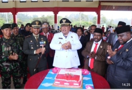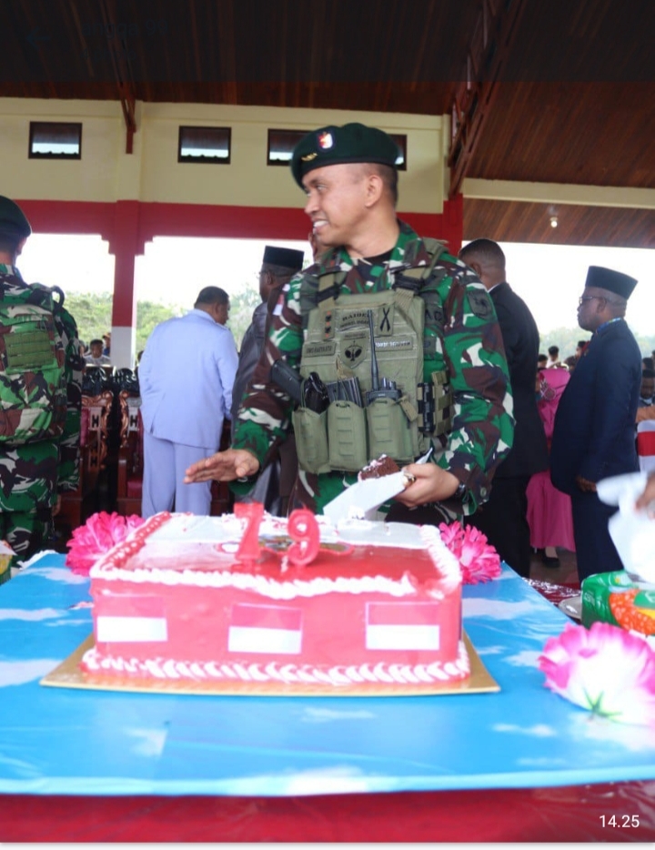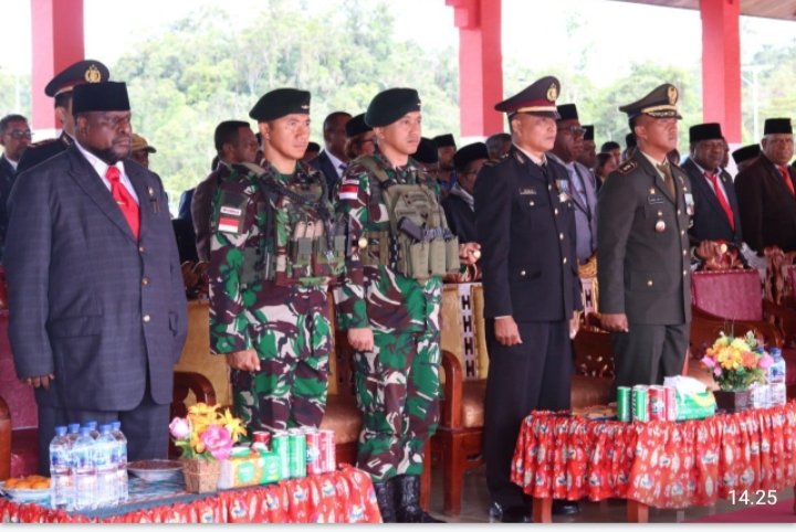 [ MAYBRATKlivetvindindonesia.com- Dalam rangka meningkatkan rasa nasionalisme dan memperingati HUT Republik Indonesia ke-79 di penugasan, anggota Satgas Pamtas RI-PNG Kewilayahan Papua Barat Daya Yonif 762/VYS, Satgas Yonif 501/BY beserta unsur Forkompinda dan warga Kabupaten Maybrat melaksanakan upacara pengibaran bendera di Alun-alun Vaitmayaf, Distrik Aifat, Kabupaten Maybrat Sabtu (17/8/2024).