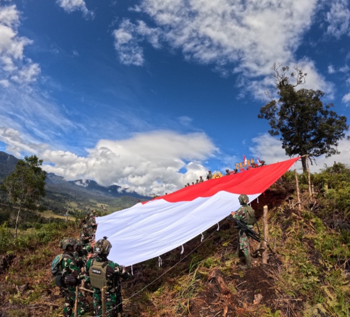 Satgas Yonif 323 Buaya Putih Kibarkan Bendera Raksasa di Atas Ketinggian Bukit Cakra Papua