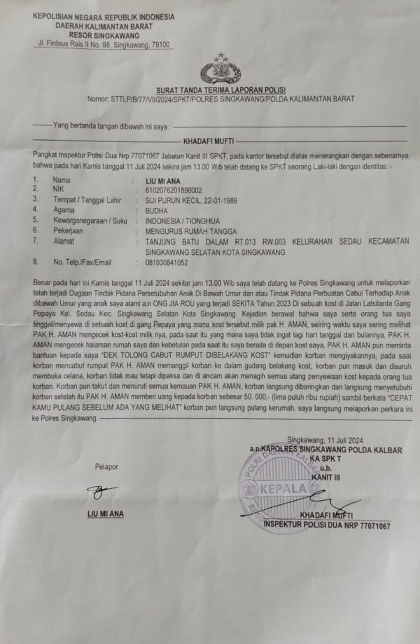 Berdasarkan Surat Tanda Laporan Polisi nomor:STTLP/B/77/VII/2024/SPKT/POLRES SINGKAWANG/POLDA KALIMANTAN BARAT. Yang dibuat pada hari Kamis (11/7/2024) sekira pukul 13.00 Wib, pelapor ibu korban dugaan persetubuhan anak di bawah umur terhadap anaknya yang baru berusia 13 tahun, yang di terima oleh KA SPKT u.b. KANIT III IPDA KHADAFI MUFTI NRP 77071067.