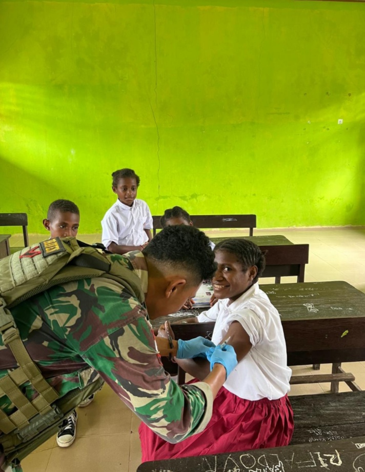 [ TAMBRAW ] KLTV INDONESIA.com- Satgas pamtas RI-PNG kewilayahan Papua Barat Daya Yonif 762/VYS Pos Yembun bersinergi dengan puskesmas Distrik Yembun melaksanakan BIAS (Bulan Imunisasi Anak Sekolah) dengan sasaran 3 sekolah di Distrik Yembun yaitu SDN 28 Yembun, SMPN 1 Yembun dan SMK N 1 Yembun, Kamis (22/08/2024).