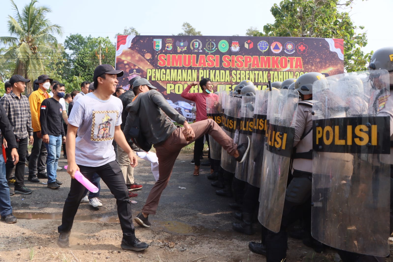 Usai simulasi di TPS, kegiatan berlanjut dengan simulasi pengendalian massa (dalmas) yang berlangsung di depan kantor KPU Pesawaran. Dalam skenario ini, eskalasi situasi yang awalnya kuning, di mana massa masih terkendali, meningkat menjadi merah ketika massa bertambah dan mulai menunjukkan tindakan anarkis. Untuk mengatasi situasi ini, personel Brimob Polda Lampung dan Polres Pesawaran turut dikerahkan untuk melaksanakan aksi penguraian massa.