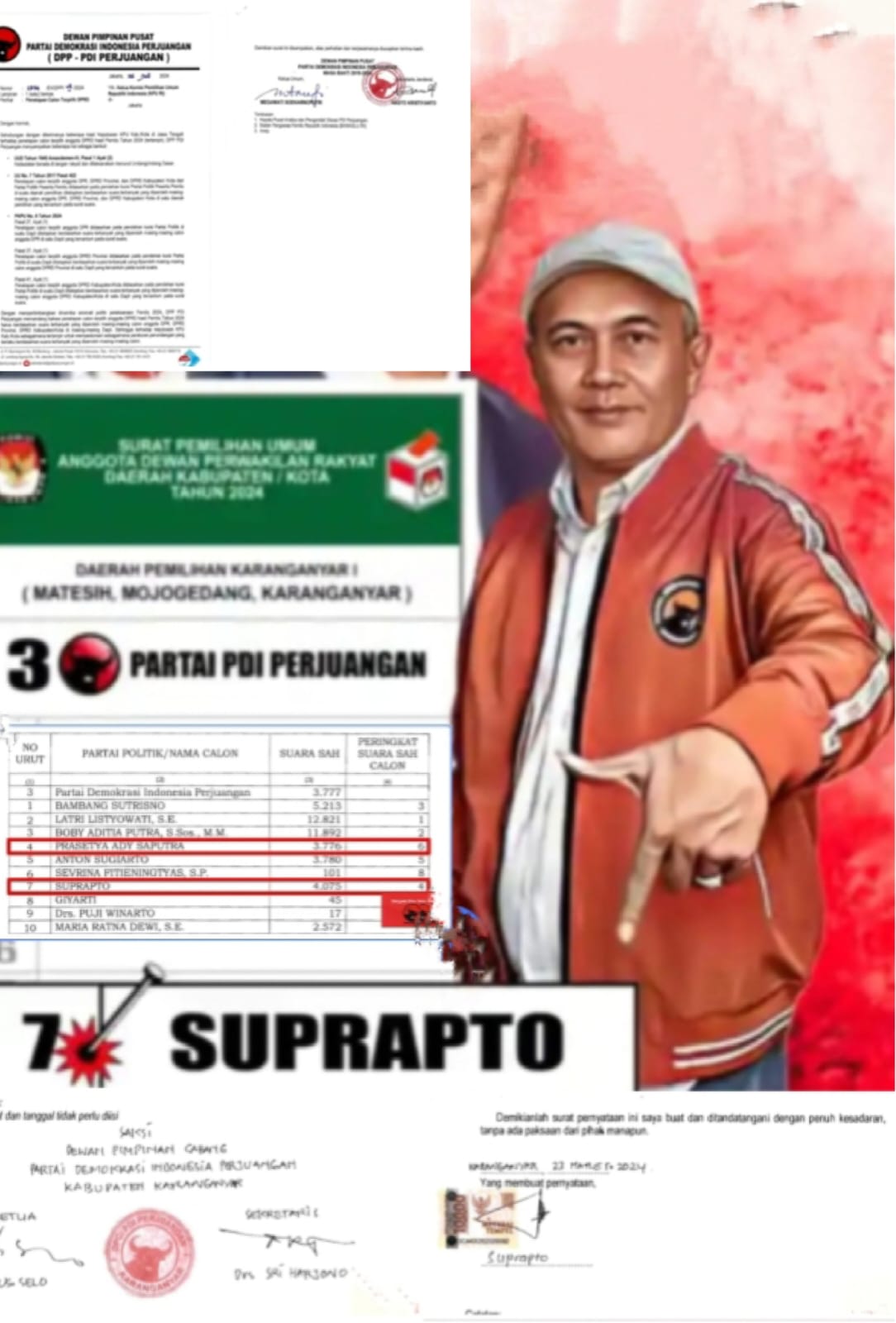 DPC PDI Perjuangan Kabupaten Karanganyar sudah mengajukan surat pengunduran dirinya ke KPU Karanganyar, Suprapto justru mempertanyakan kinerja KPU. Juga institusi Bawaslu selaku pengawas jalannya pemilu.