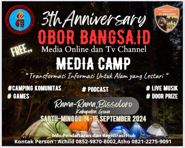 Ditempat terpisah Abu Husain ST yang juga sebagai sekretaris kegiatan ini menambahkan, Kemarin anniversary kami berlangsung di pantai, sekarang kami melaksanakan di alam perkemahan Bissoloro Kab Gowa, ini mengartikan bahwa dalam kegiatan Kemah Camp kami ingin mendekatkan para awak Media khususnya dengan alam terbuka ini. adapun rangkaian kegiatannya membuat podcast di alam terbuka, live musik,Games serta beberapa door prize menarik yang di siapkan oleh panitia pelaksana dan Insya Allah kegiatan Kemah Anniversary Obor Bangsa akan diikuti kurang lebih 150 peserta dan setiap peserta akan mendapatkan Piagam penghargaan dari perusahaan Obor Bangsa terang Atho sapaan akrab Abu Husain.