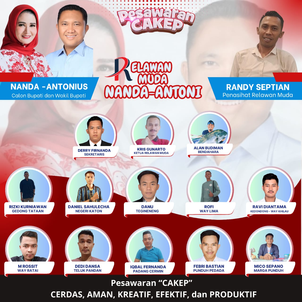 Klivetvindonesia,com. Pesawaran- Sekelompok anak muda yang menamakan diri Relawan Muda Nanda-Antonius bertekad mengulang sukses Pilkada dengan mengantarkan kemenangan kepada Pasangan Calon (Paslon) Bupati dan Wakil Bupati Pesawaran Nanda Indira – Antonius Muhammad Ali pada Pilkada serentak 27 November 2024.