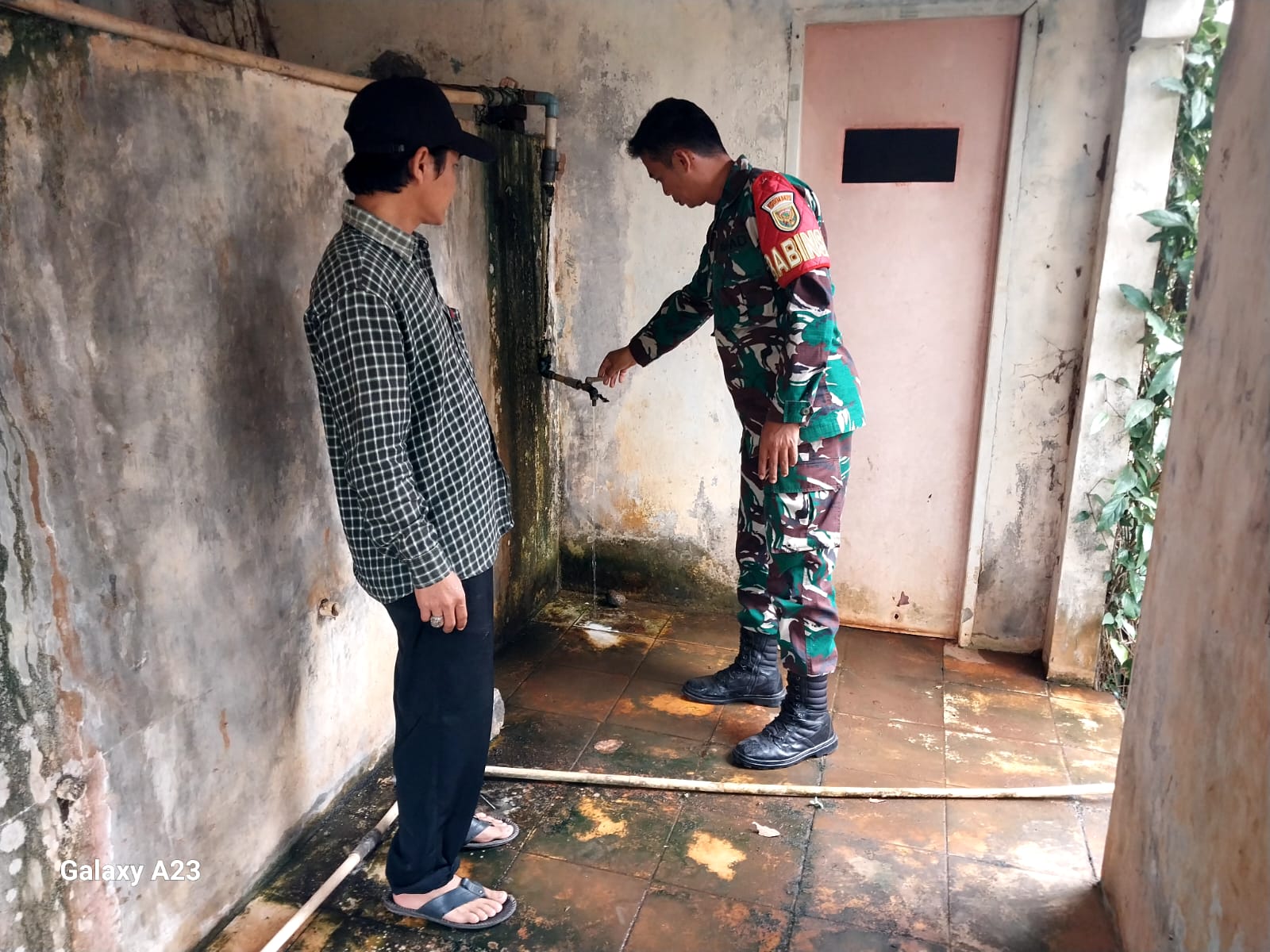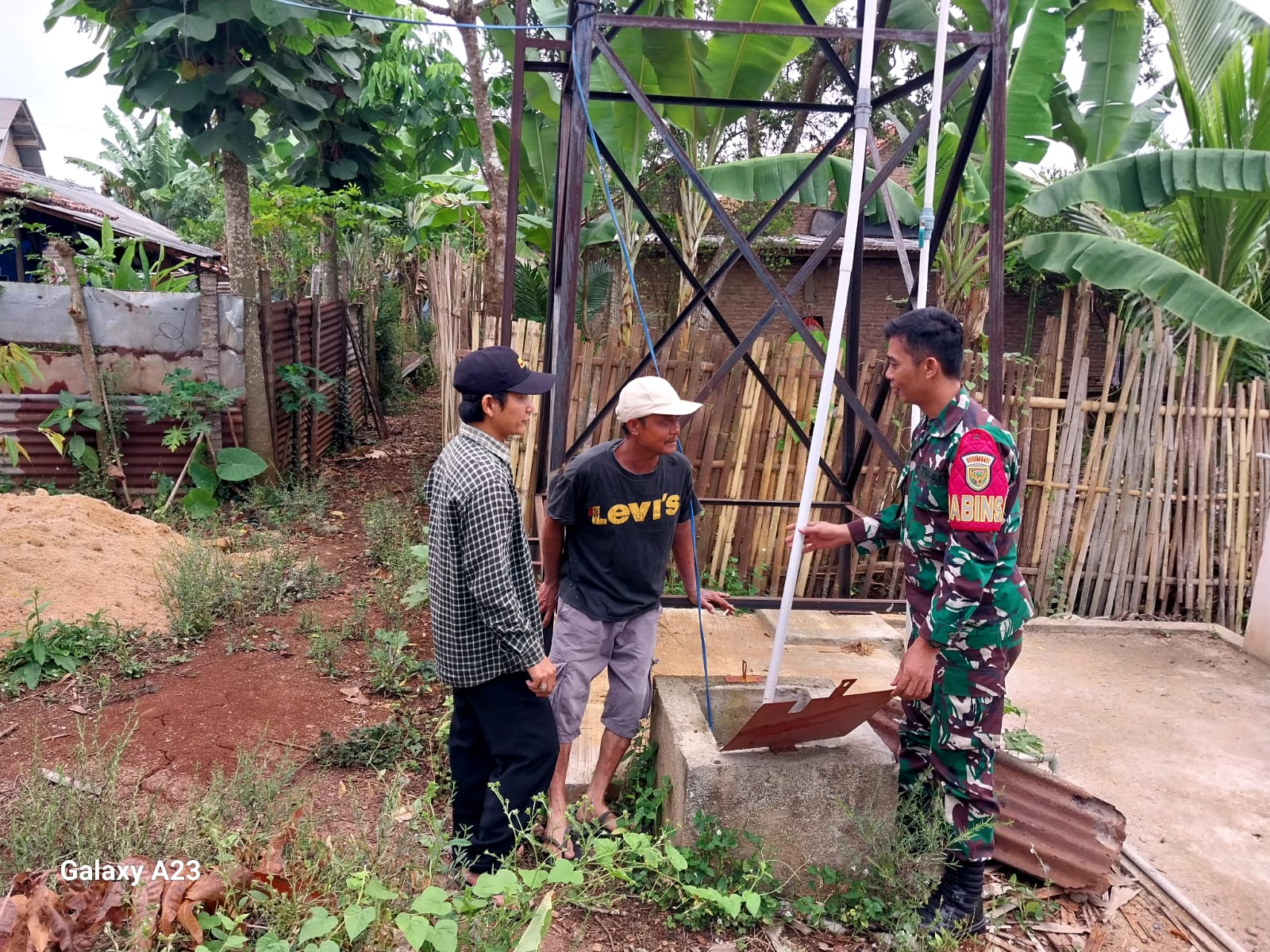 Babinsa Koramil 421-01/Kedondong Serda Teguh Rinjani bersama masyarakat terjun langsung melihat sarana Pamsimas untuk memastikan ketersediaan air bersih di Dusun Tanjung Lom Desa Pekondoh Kecamatan Way Lima, Kabupaten Pesawaran. jum’at (12/9/2024).