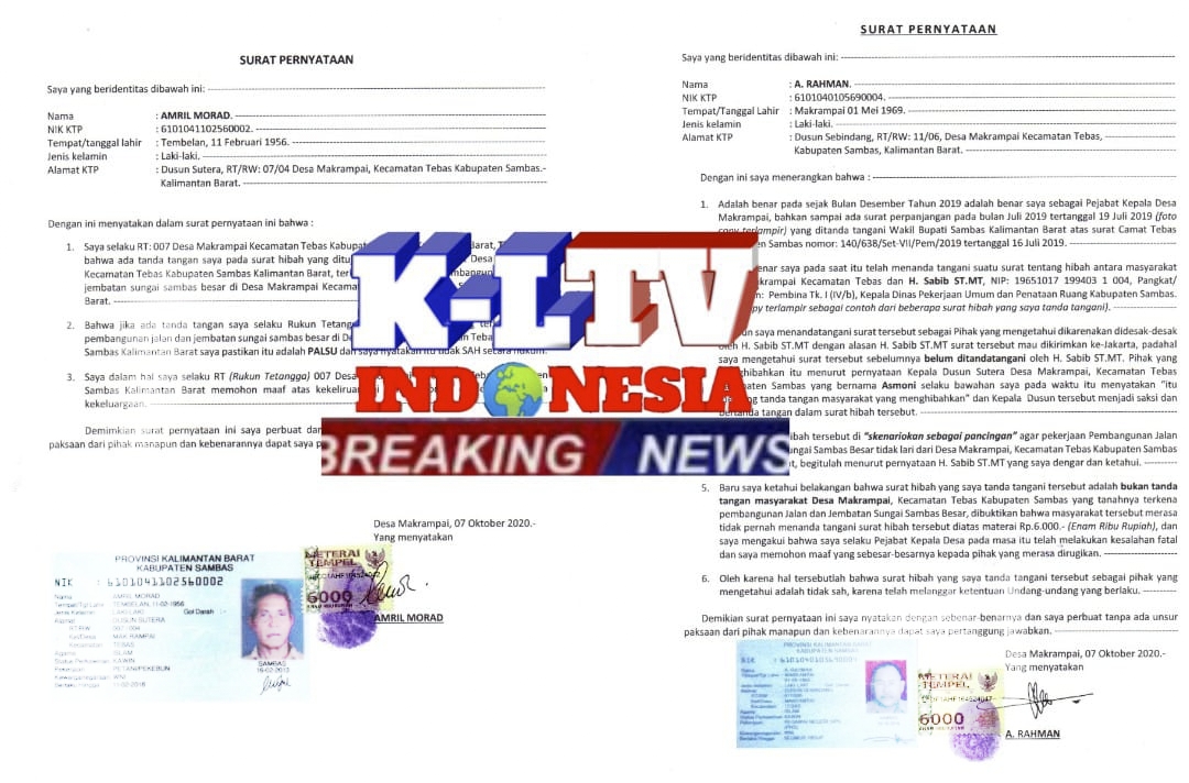 klivetvindonesia.com,Pontianak – Diduga Kuat Mantan Kadis PUPR Kabupaten Sambas Sebagai Aktor Intelektual Dalam Dugaan Pemalsuan Tanda Tangan, Mencuat aroma busuk dibalik pembangunan jembatan sambas, 25 September 2024.