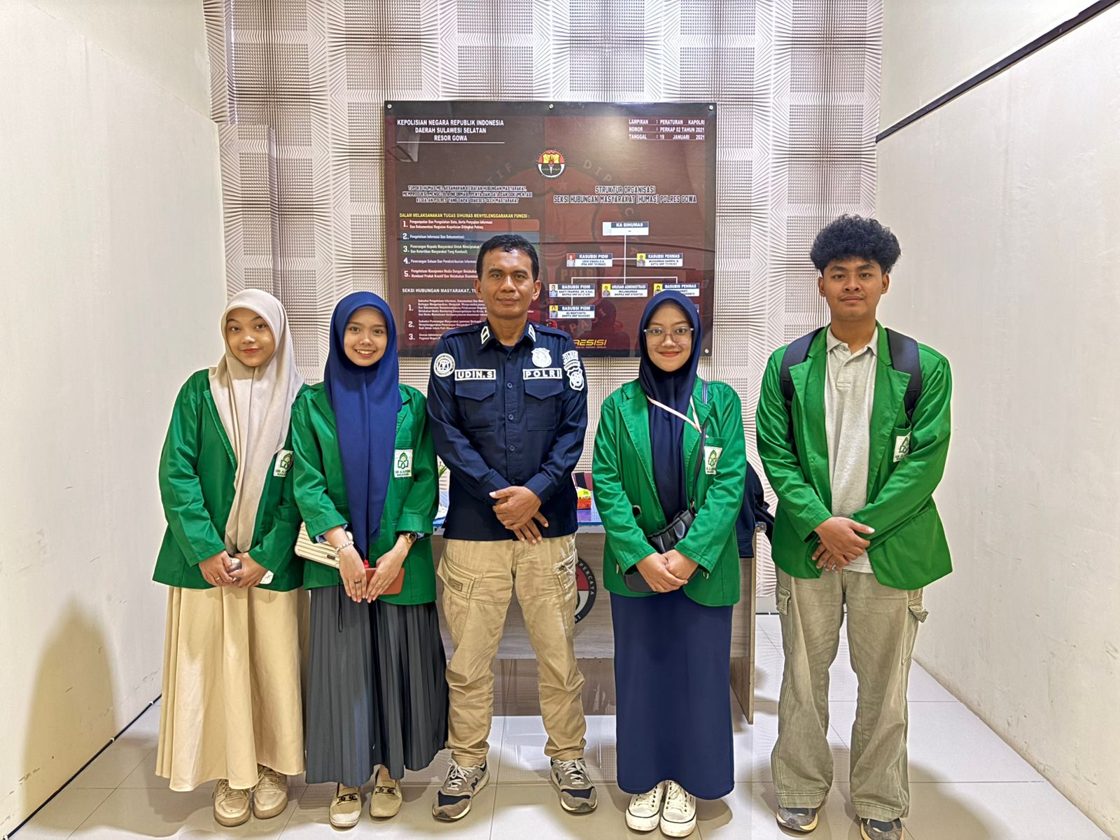 Kasubsi PIDM Seksi Humas Polres Gowa, IPDA Udin Sibadu, S.H., menyambut para mahasiswa dengan hangat dan memberikan pemaparan komprehensif tentang tugas serta fungsi humas kepolisian. Ia juga menjelaskan strategi Public Relations yang diterapkan oleh Polres Gowa dalam membangun citra positif institusi.