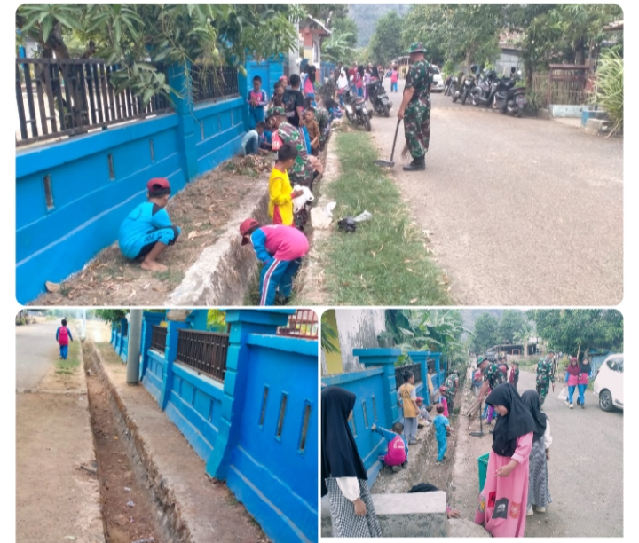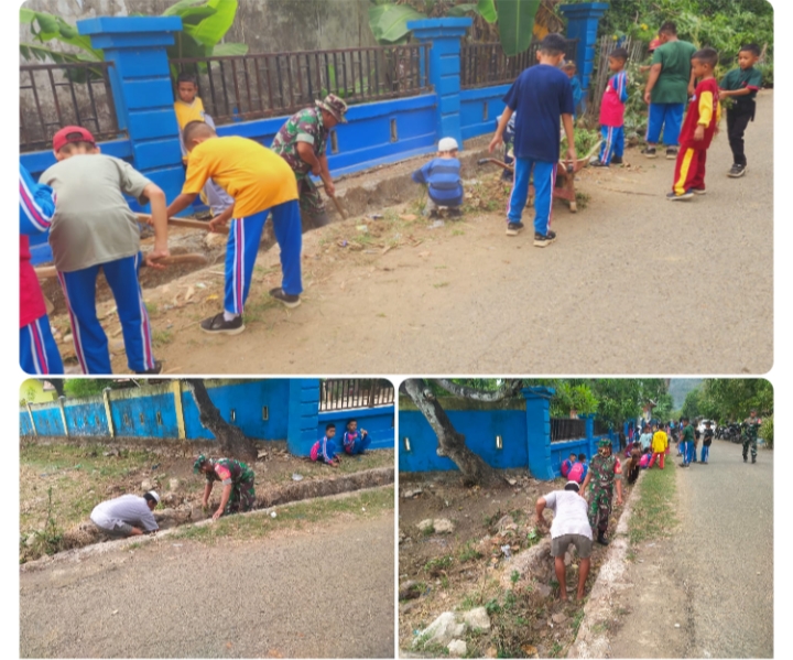 –klivetvindonesia.com— Kapten Cke Abdul Gaffar Danramil 1421-04/Labakkang memimpin para Personil Anggotanya bersama Kepala sekolah, guru beserta para murid sekolah dasar negeri (SDN) 35 Leange turun langsung melaksanakan kegiatan Kerja Bakti pembersihan halaman sekolah dan Jalan Depan sekolah.