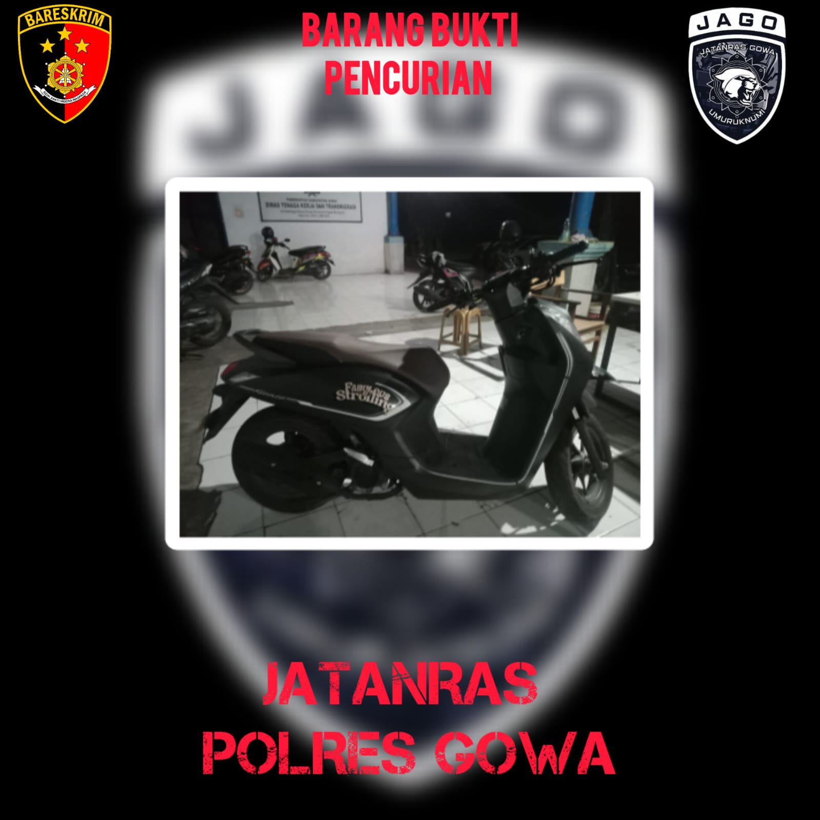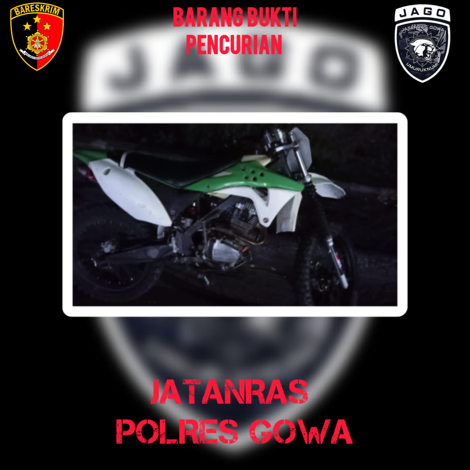 Barang bukti yang berhasil diamankan dari tangan pelaku antara lain satu unit sepeda motor Honda GL Pro yang telah dimodifikasi menjadi motor trail dan sepeda motor Honda Genio hitam yang digunakan pelaku dalam aksinya.