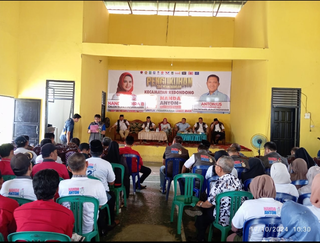 Klivetvindonesia,com. Pesawaran- Tim Pemenangan Koalisi Untuk Rakyat (KUR) Pasangan Calon (Paslon) Bupati dan Wakil Bupati Kabupaten Pesawaran nomor urut 2, Nanda Indira -Antonius Muhammad Ali mengukuhkan tim pemenangan Kecamatan Kedondong dan Waykhilau, Kamis 17 Oktober 2024.