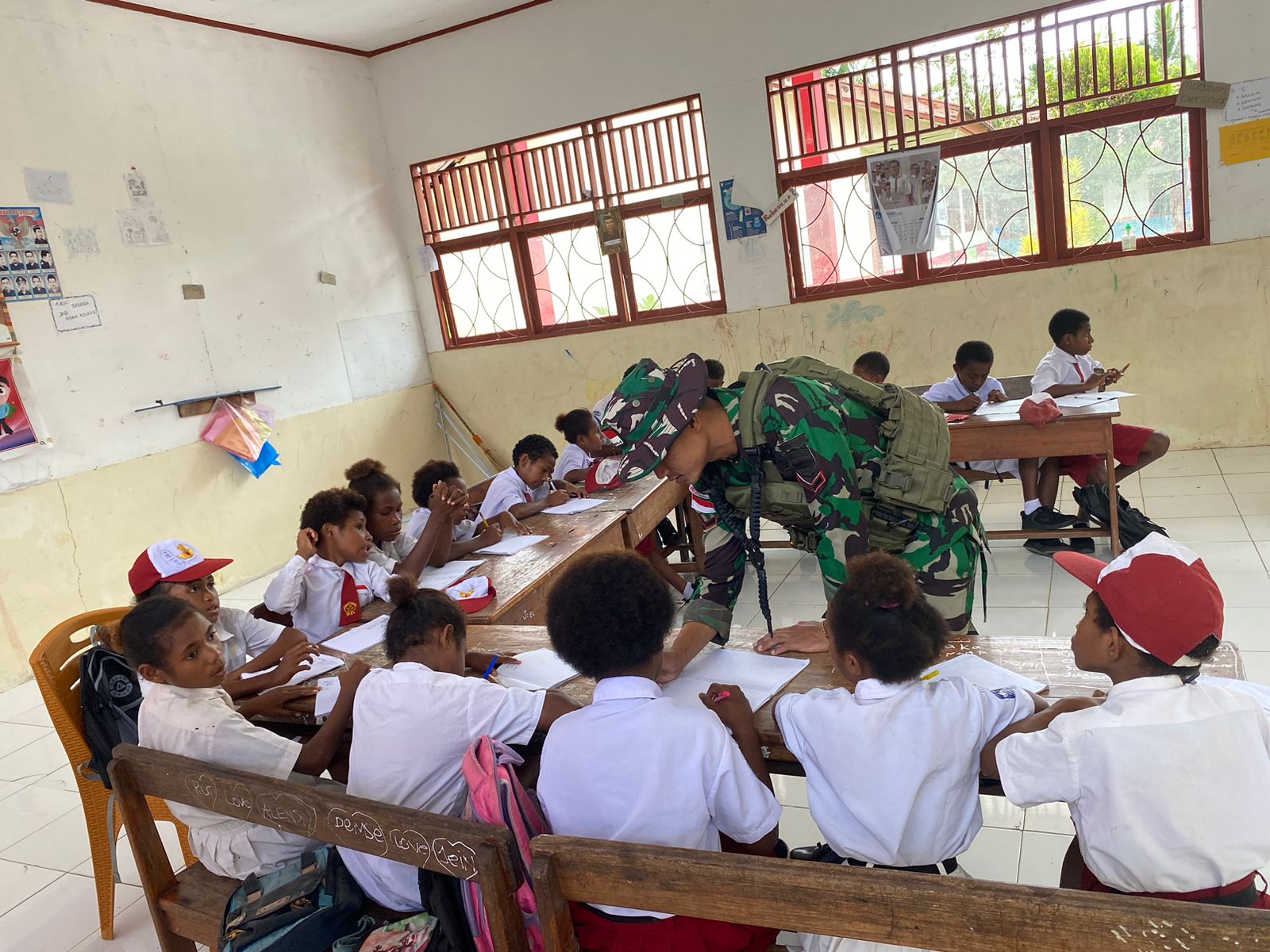 –klivetvindonesia.com-[ KEEROM ] – Membantu meningkatkan kualitas pendidikan bagi anak-anak di perbatasan, Pos Mosso Satgas Pamtas RI-PNG Yonif 131/BRS melaksanakan kegiatan mengajar di SD Mosso, Distrik Muara Tami Kab. Keerom, Senin (21/10/2024).