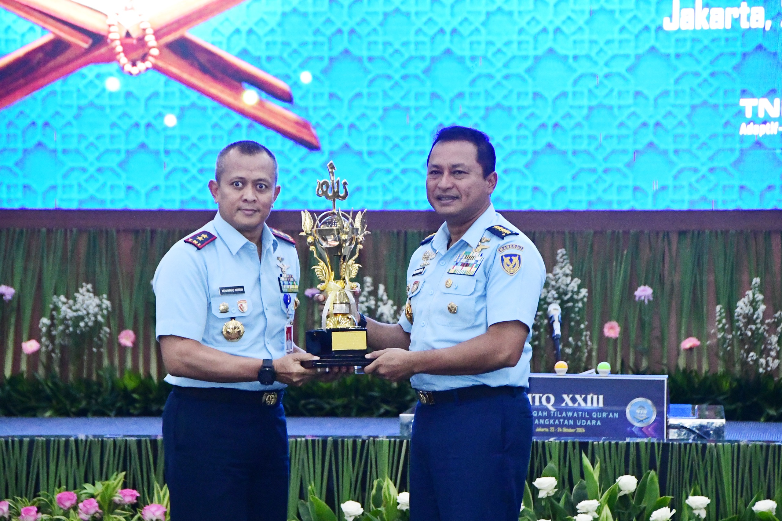 –klivetvindonesia.com– [ JAKARTA ] – Pangkoops Udara I Marsda TNI Mohammad Nurdin menyerahkan Piala Bergilir yang dahulu diberikan pada masa Kasau Marsekal TNI Fadjar Prasetyo, S.E., M.P.P., C.S.F.A. kepada Koops Udara I dalam raihan Juara Umum MTQ ke-XXII tahun 2021, yang kemudian pada saat ini Piala Bergilir tersebut diserahkan kembali kepada Kasau Marsekal TNI M. Tonny Harjono, S.E., M.M., yang kemudian diserahkan kepada Kadisbintalidau, untuk membuka Musabaqah Tilawatil Quran (MTQ) ke-XXIII TNI AU tahun 2024. Bertempat di GSG Suharnoko Harbani, Mabesau. (Selasa, 23-10-2024).