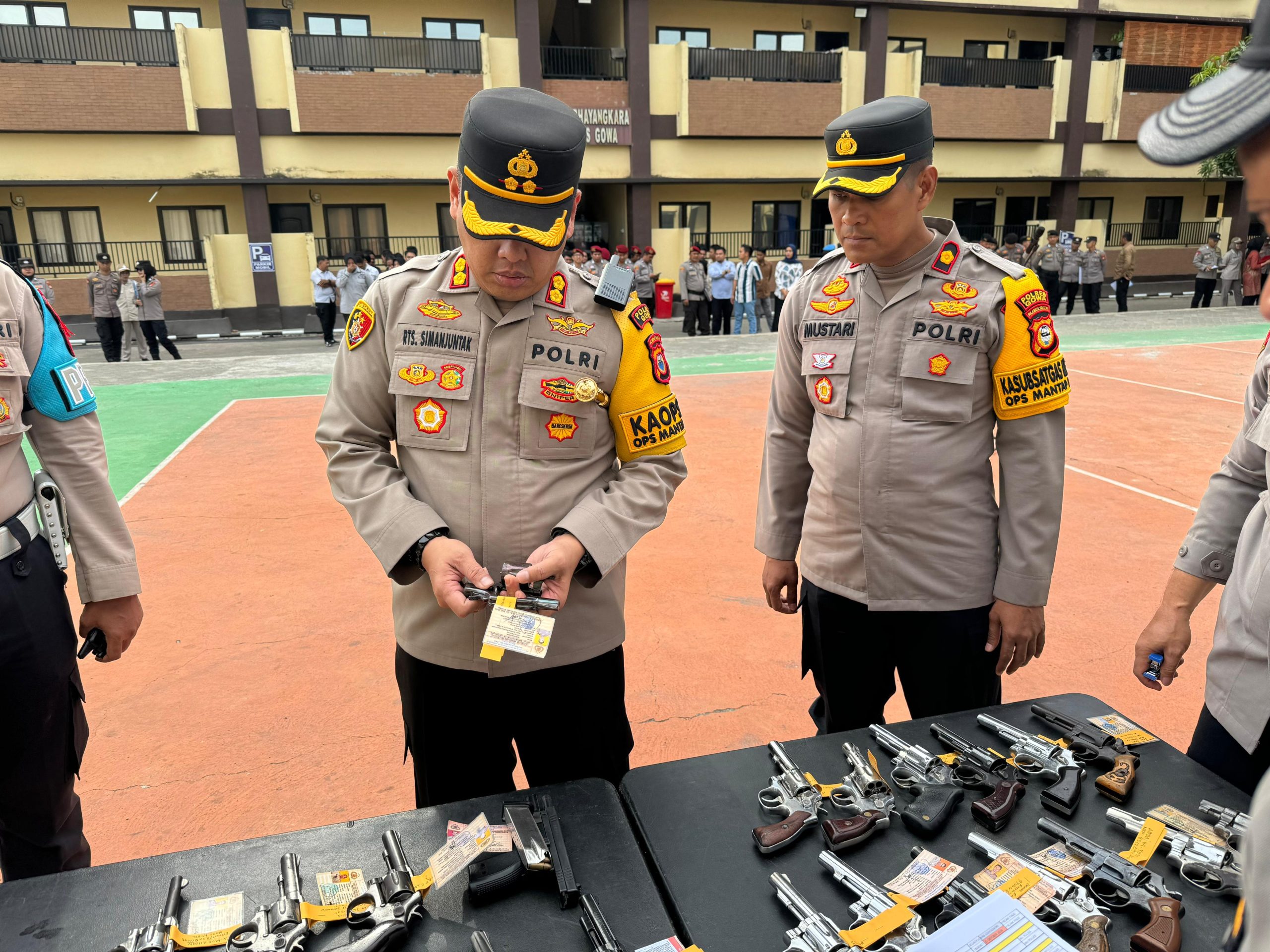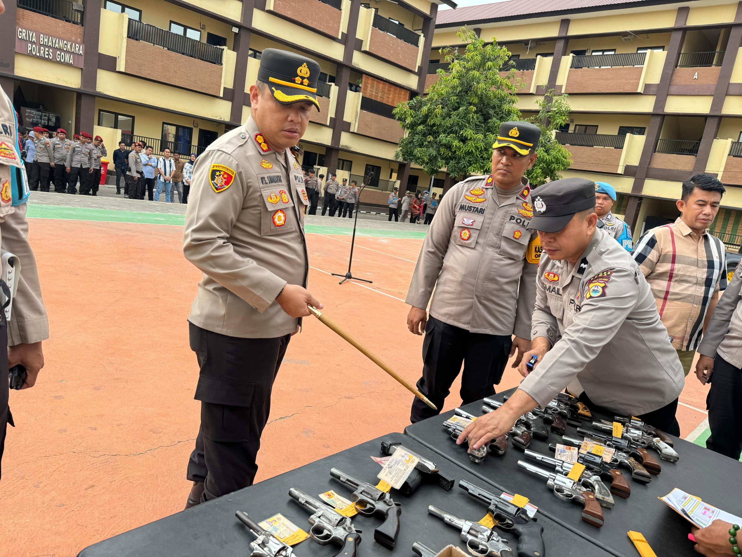 Pemeriksaan ini di gelar di lapangan Griya Bhayangkara Polres Gowa, bertujuan untuk memastikan bahwa semua personel yang memegang senjata api memiliki izin yang sah dan dalam kondisi baik.