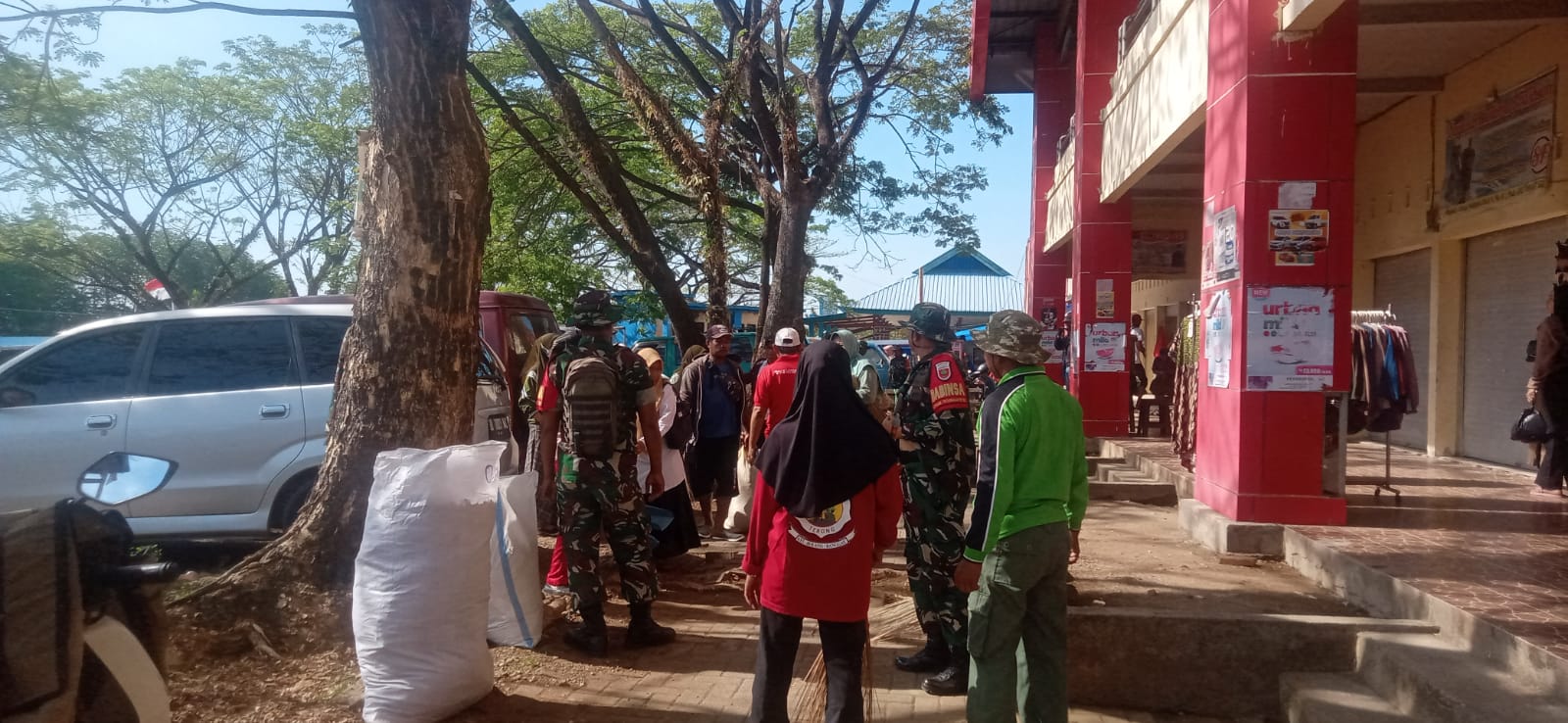 Kesejahteraan, terlihat anggota TNI dari Koramil 1421-02/Minasatene, dipimpin langsung oleh Danramil Lettu Inf Umar Abeto, bahu-membahu bersama masyarakat setempat dalam kegiatan karya bakti pembersihan Lingkungan Pasar kalibone