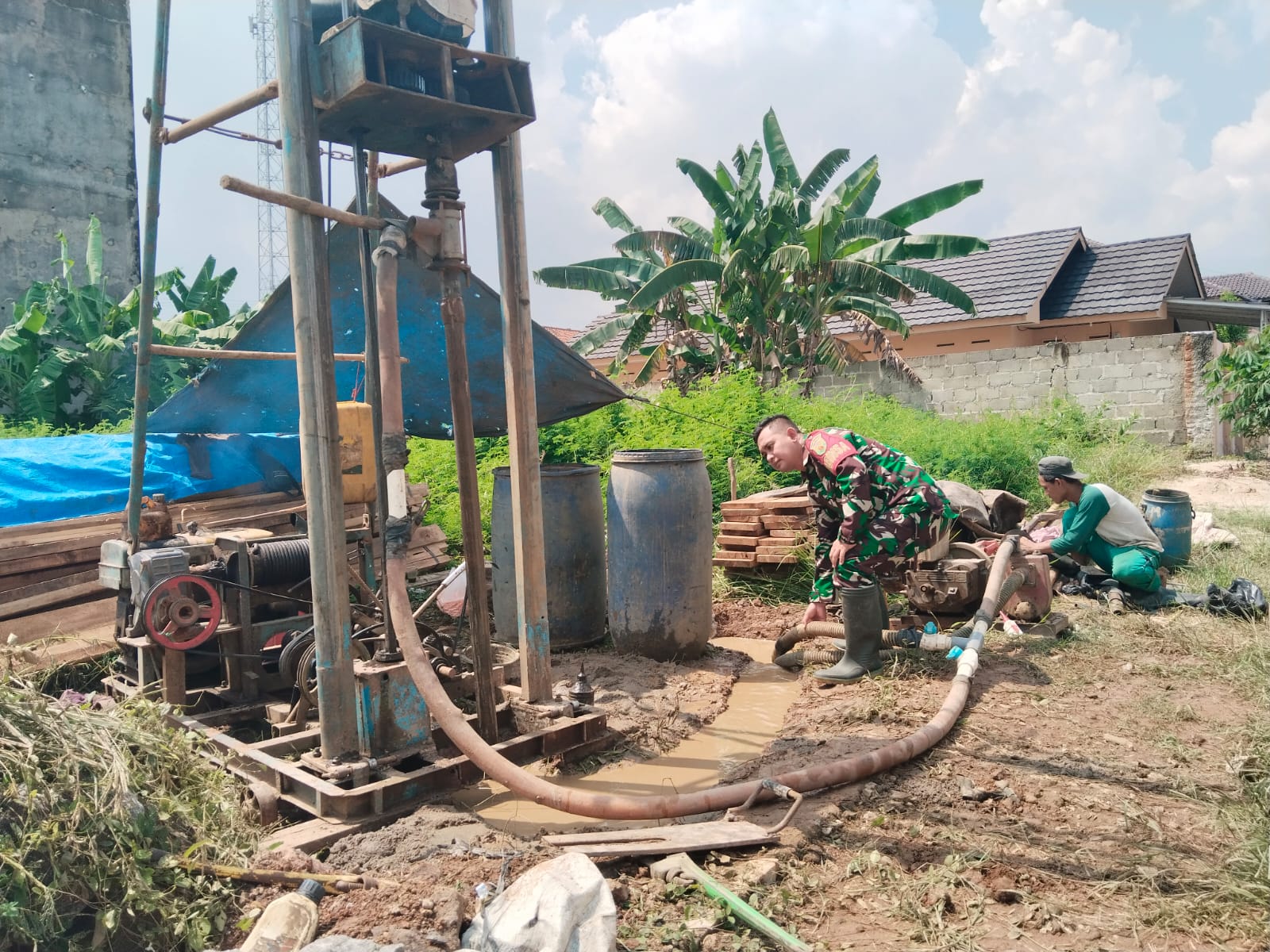 Klivetvindonesia,com. Pesawaran- Air merupakan sumber kehidupan untuk keberlangsungan makhluk hidup, demi menopang kebutuhan tentang air tersebut berbagai upaya dilakukan tak terkecuali dengan mengunakan mesin untuk membantu proses pembuatan sumur. Hal ini seperti yang dilakukan salah satu warga yakni membuat sumur bor guna memenuhi kebutuhan rumah tangga di Desa Sinar Harapan Kecamatan Kedondong, Kabupaten Pesawaran. Dengan sigap nampak salah satu Prajurit TNI melalui Bintara Pembina Desa (Babinsa) dari jajaran Koramil 421-01/Kedondong Serda Yerri Franata yang begitu peduli dengan kesulitan warga binaan berjibaku membantu mendampingi proses pembutan sumur bor tersebut. Pada Selasa (12/11/2024).