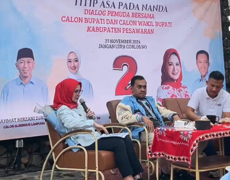 Hal itu disampaikan oleh Calon Bupati (Cabup) Kabupaten Pesawaran nomor urut 2 Nanda Indira, saat menghadiri kegiatan Titip Asa Pada Nanda “Dialog Pemuda Bersama Calon Bupati dan Wakil Bupati Pesawaran Nanda – Anton” di Cafe Backland Desa Bagelen Kecamatan Gedong Tataan kabupaten setempat, Kamis 14 November 2024.
