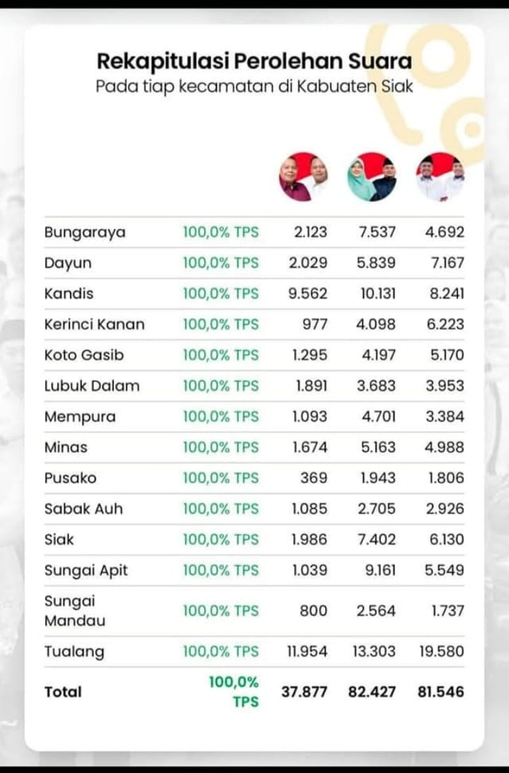 Siak,||KOTA INDONESIA.com – Dr.Afni-Syamsurizal unggul di Pilkada Siak berdasarkan penghitungan C1 surat suara. Paslon nomor urut 2 ini meraih 82.427 suara (40,8%) berdasarkan rekapitulasi hasil suara dari seluruh 828 TPS (100%) di Kabupaten Siak, Rabu (27/11/2024).