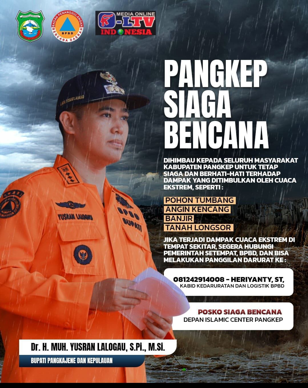 klivetvindonesia.com, PANGKEP– Bupati Pangkajene dan Kepulauan (Pangkep), DR. H. Muhammad Yusran Lalogau, SP, MSi, mengingatkan masyarakat untuk tetap waspada terhadap potensi bencana akibat cuaca ekstrem. Beliau menekankan pentingnya kesiagaan menghadapi ancaman seperti pohon tumbang, tanah longsor, dan banjir yang dapat terjadi sewaktu-waktu