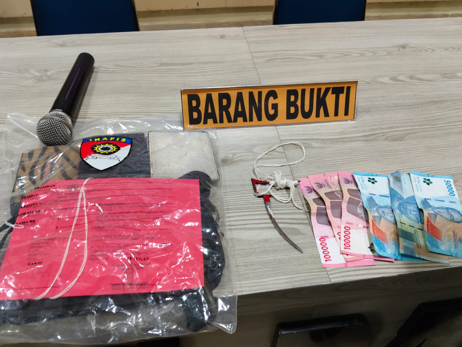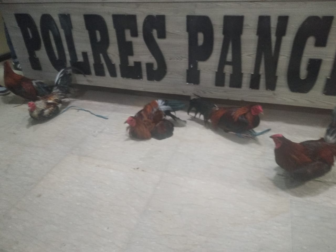 Dalam operasi tersebut, aparat penegak hukum menyita sejumlah barang bukti penting, antara lain: uang tunai senilai Rp 1.451.000,- yang ditemukan pada tubuh tersangka, uang tunai Rp 450.000,- yang ditemukan di tempat kejadian perkara (TKP) sabung ayam, enam ekor ayam jantan yang sedang aduan, dan satu ekor ‘taji’, yakni taji tajam yang ditancapkan pada kaki ayam jantan, yang digunakan untuk melukai hingga mengakibatkan kematian dalam aduan ilegal ini.